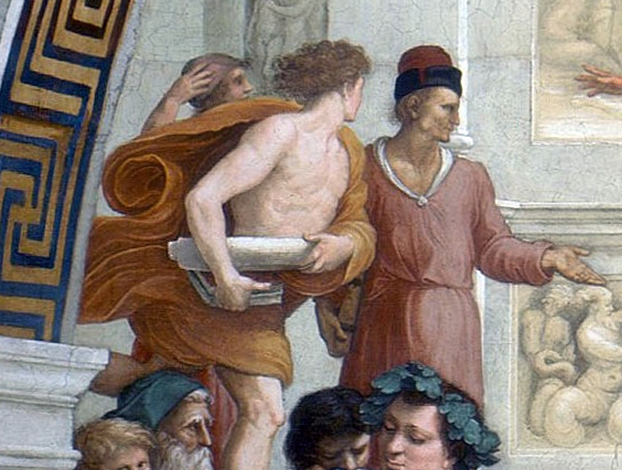 그가 어떤 철학자였는지는 이 어트리뷰트에서도 충분히 짐작할 수 있다. 아, 그리고 헤라클레이토스의 얼굴을 자세히 보라. 미켈란젤로이다