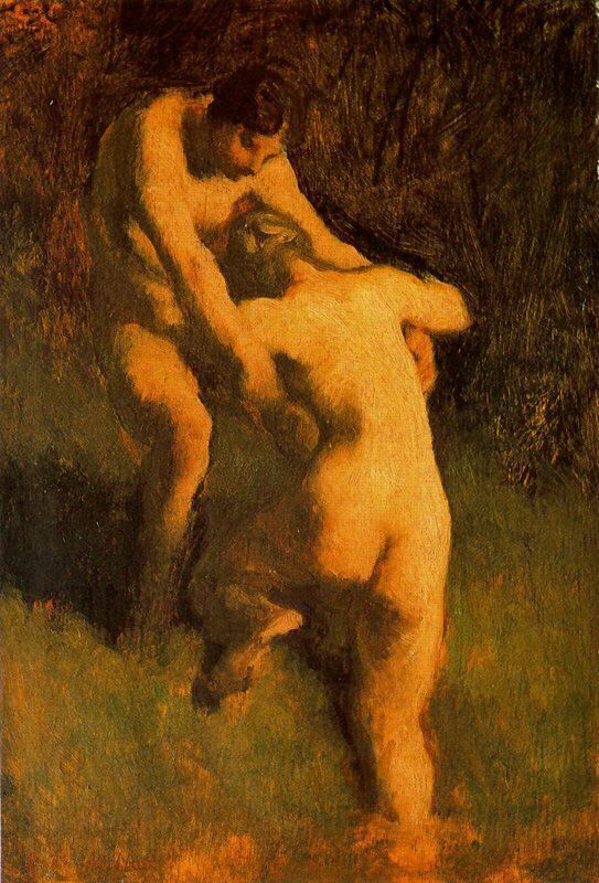 특히 인체의 억센 형체감을 살리려고 한 의도가 노동자들의 그림들과 일치된다. 작품은 남녀가 멱을 감는 정경에서 취재된 것인데, 물에서 올라오는 여인을 남자가 안아서 끌어올리는 모습이다. 두 인체가 마치 격투라도 벌이고 있는 듯한 억센 동감으로 표현되고 있다. 밀레가 미켈란젤로에게 매혹되었다고 하는 설이 이 그림을 통해 뒷받침된다.