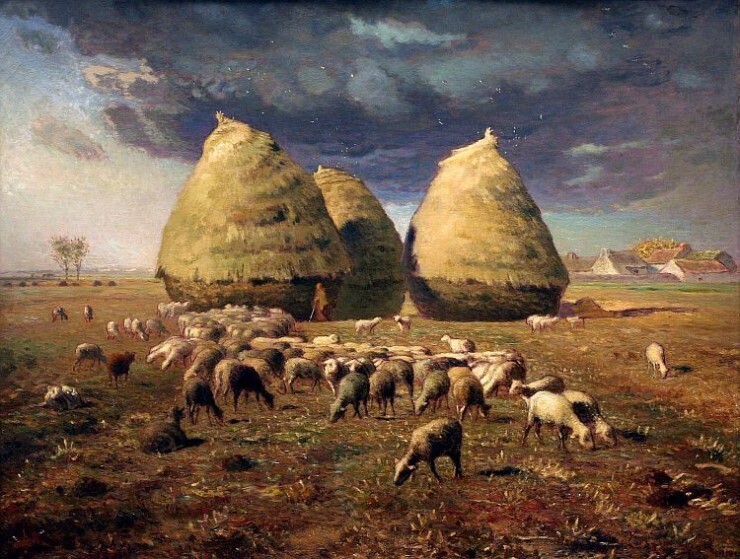 1849년 밀레는 '추수하는 사람들'(The Harvesters)를 그려 국가에 기증하였다. 파리 살롱에서는 같은 해에 '숲의 가장자리에 앉아 있는 양치기'(Shepherdess Sitting at the Edge of the Forest)라는 작품을 전시했다. 이 작품은 매우 작은 유화작으로 이전까지 그가 그려왔던 미화되고 목가적인 주제에서 보다 더 사실적이고 화가 개성적인 기법을 사용했다.