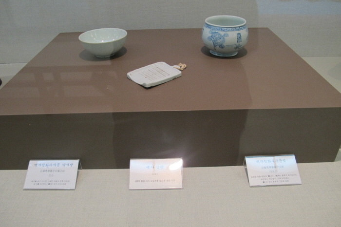 =白磁靑華 壽福字文鉢: 표면에 菊花 무늬와 ‘壽’ ‘福’글자가 새겨있으며 구면부는 격자무늬,