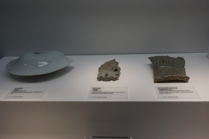 (56) 백자 뚜껑[白磁 蓋](왼쪽부터) – 청자 돈편[靑磁 墩片] –