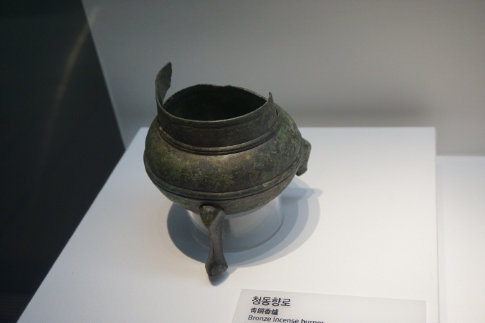 장타원형의 胴體에 짧은 목이 달려있는 청동향로로, 3개의 다리가 부착되었으나 2개만