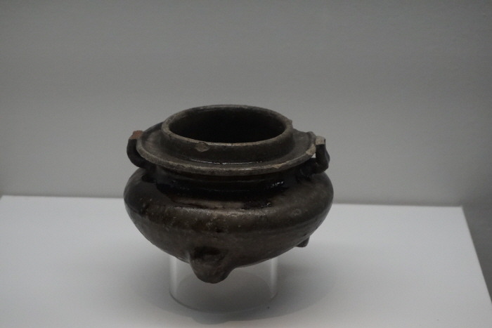 黑釉磁 香爐로 목의 안쪽에 ‘ㄴ’자로 꺾인 귀가 달려있다.