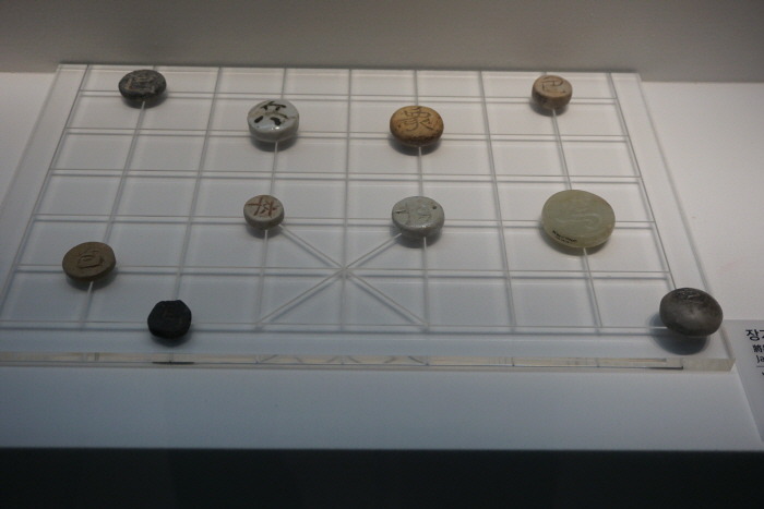 白磁와 玉石琉璃, 陶器, 차돌 등 다양한 材質로 만든 장기짝이다. 글자는 兩面에 陰刻으로