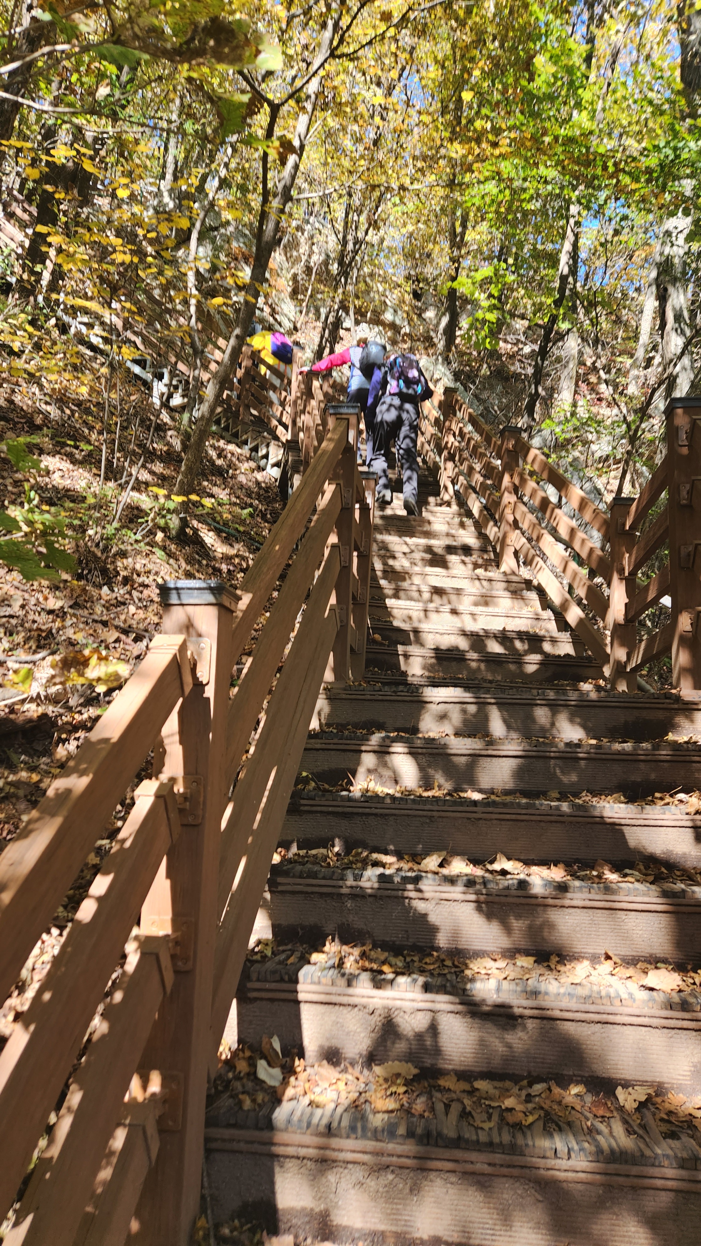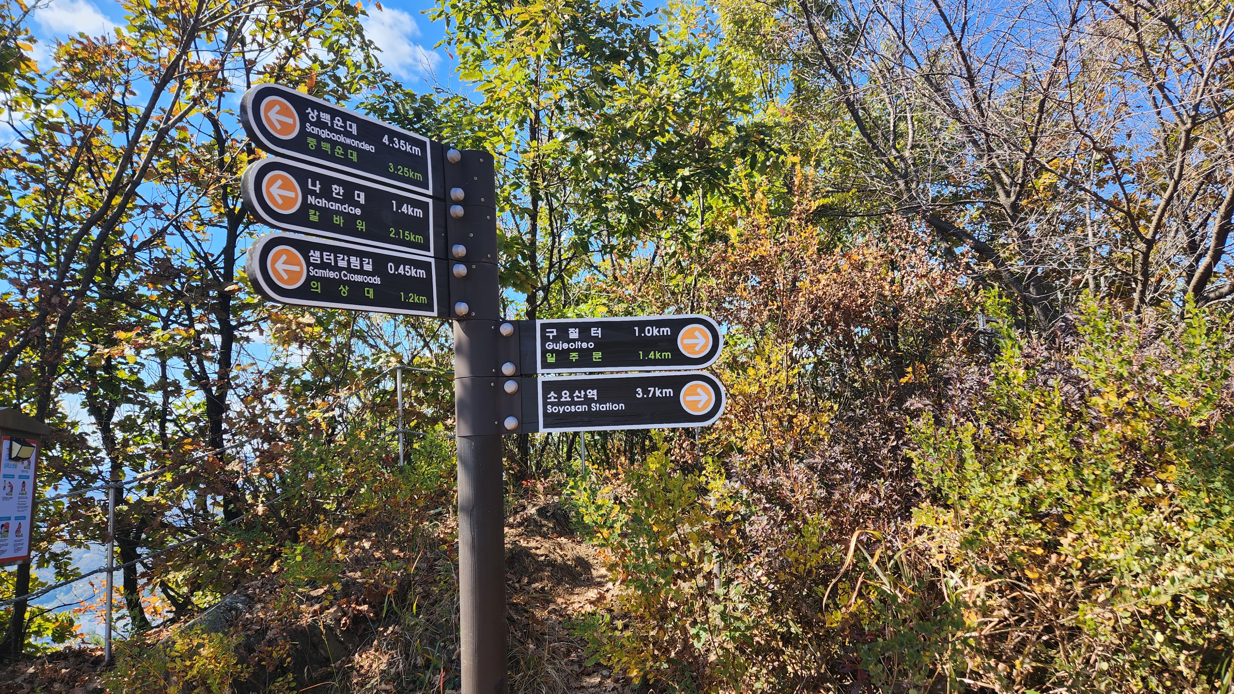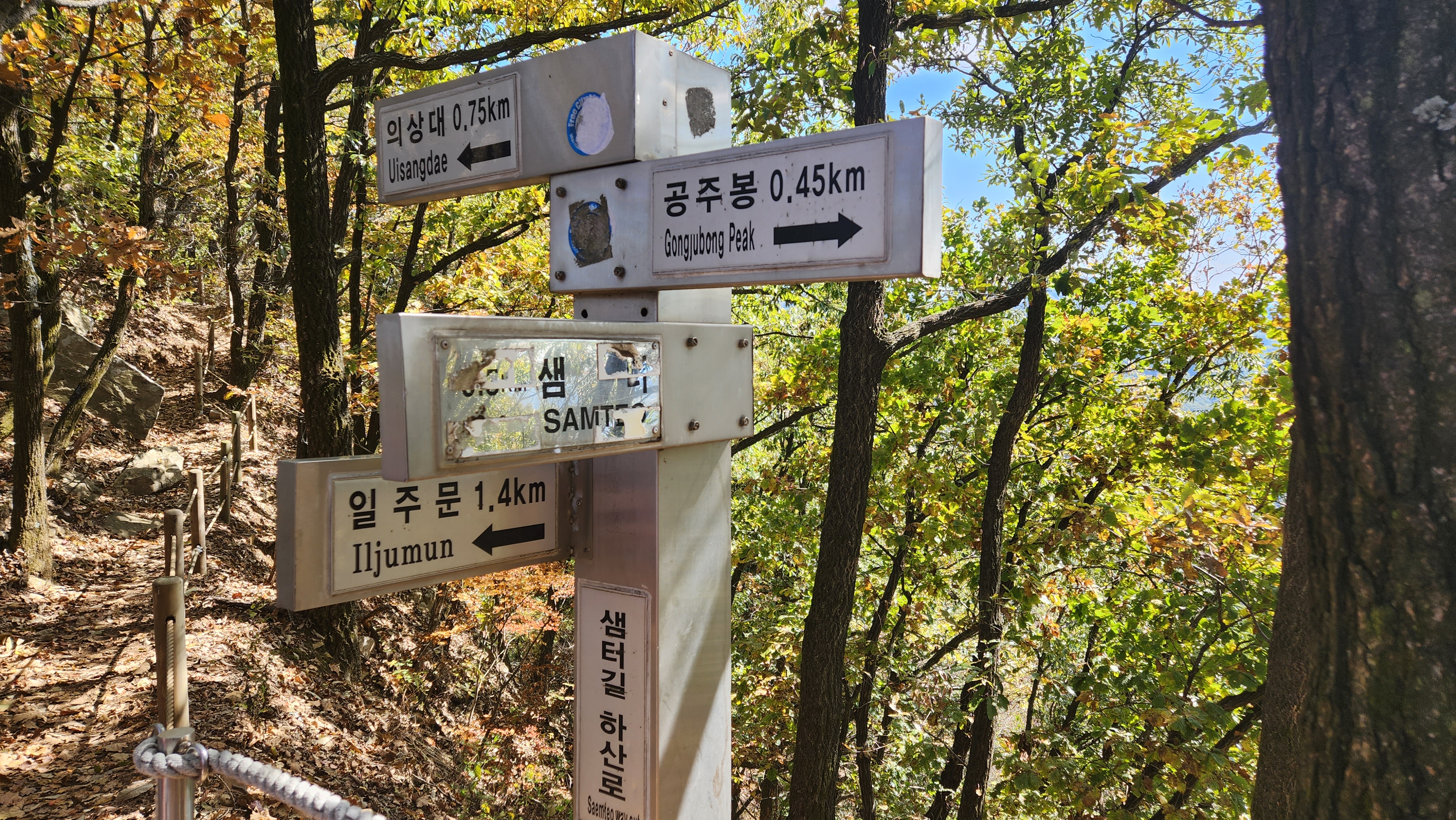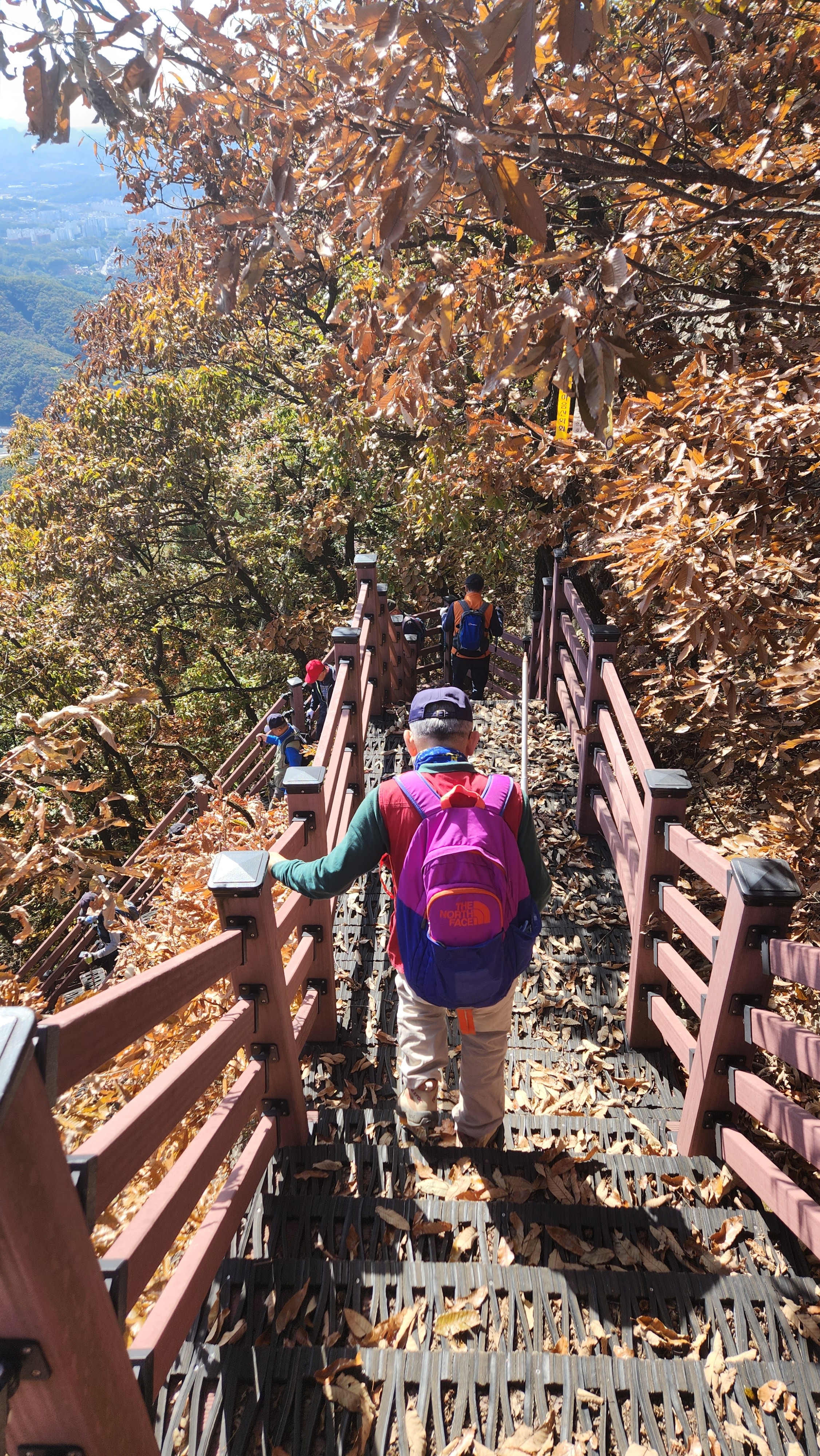 동두천에 근무하는 미군 장병들이 산행을 마치고 하산하고 있었다. 서로 눈빛으로 인사를 나누웠다. 우리나라를 지켜주기 위하여 머너먼 이국땅에서 온 미군 장병들이 얼마나 고맙고 자랑스런운지 모른다. 명수는 힘든 산행을 하면서 여기 온 동기생들이 참으로 대단하다고 하였다. 정말 그렇다. 소요산 산행 중 걷기가 가장 불편하고 가파른 길로 상급자 코스에 해당되기 때문이다. 공주봉 300m 남은 거리에서 100m 올라오는데도 시간이 많이 지체되었다. 그러나 그 이후에는 완만한 경사를 따라 올라가면 공주봉이 나온다.