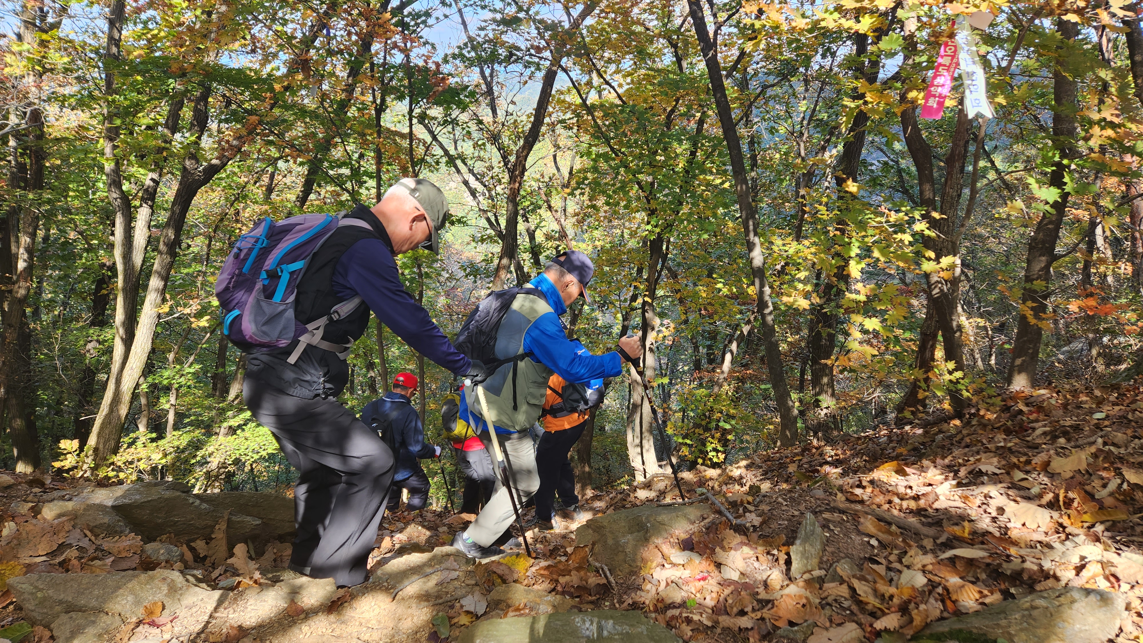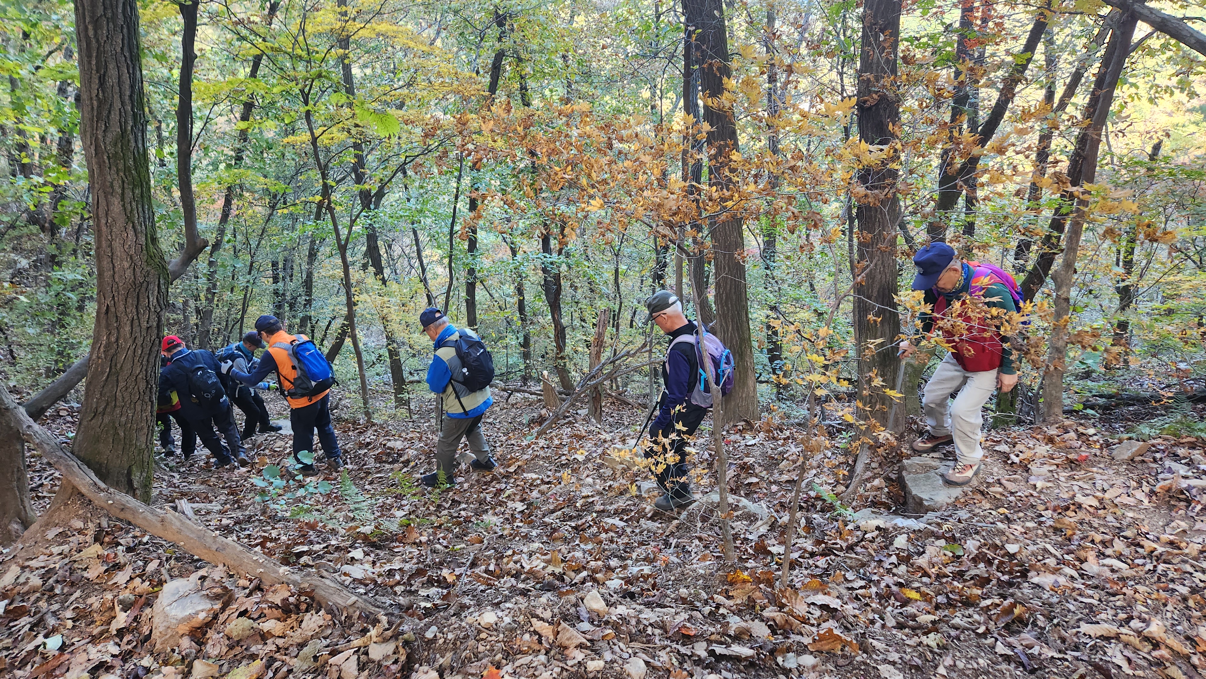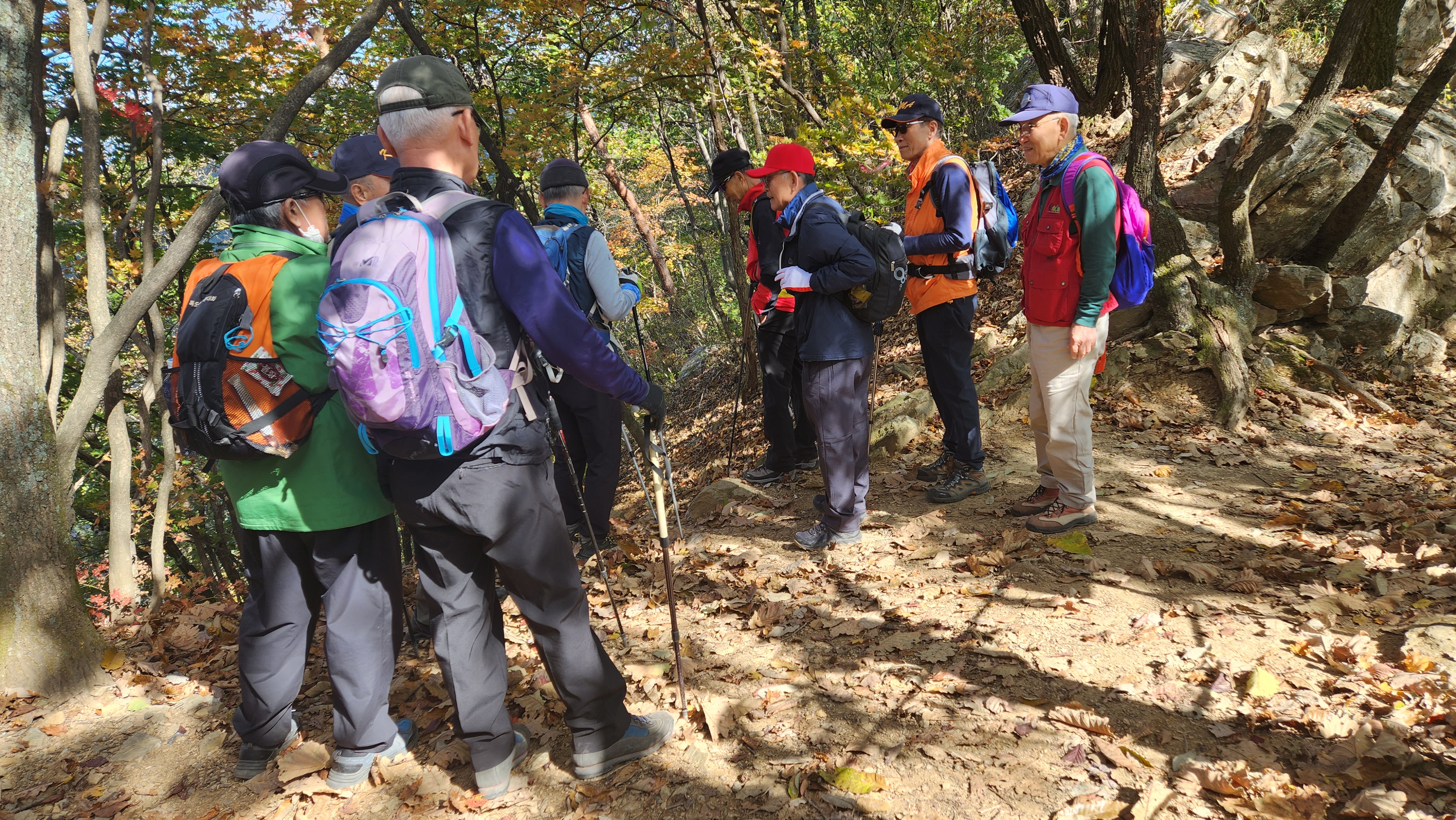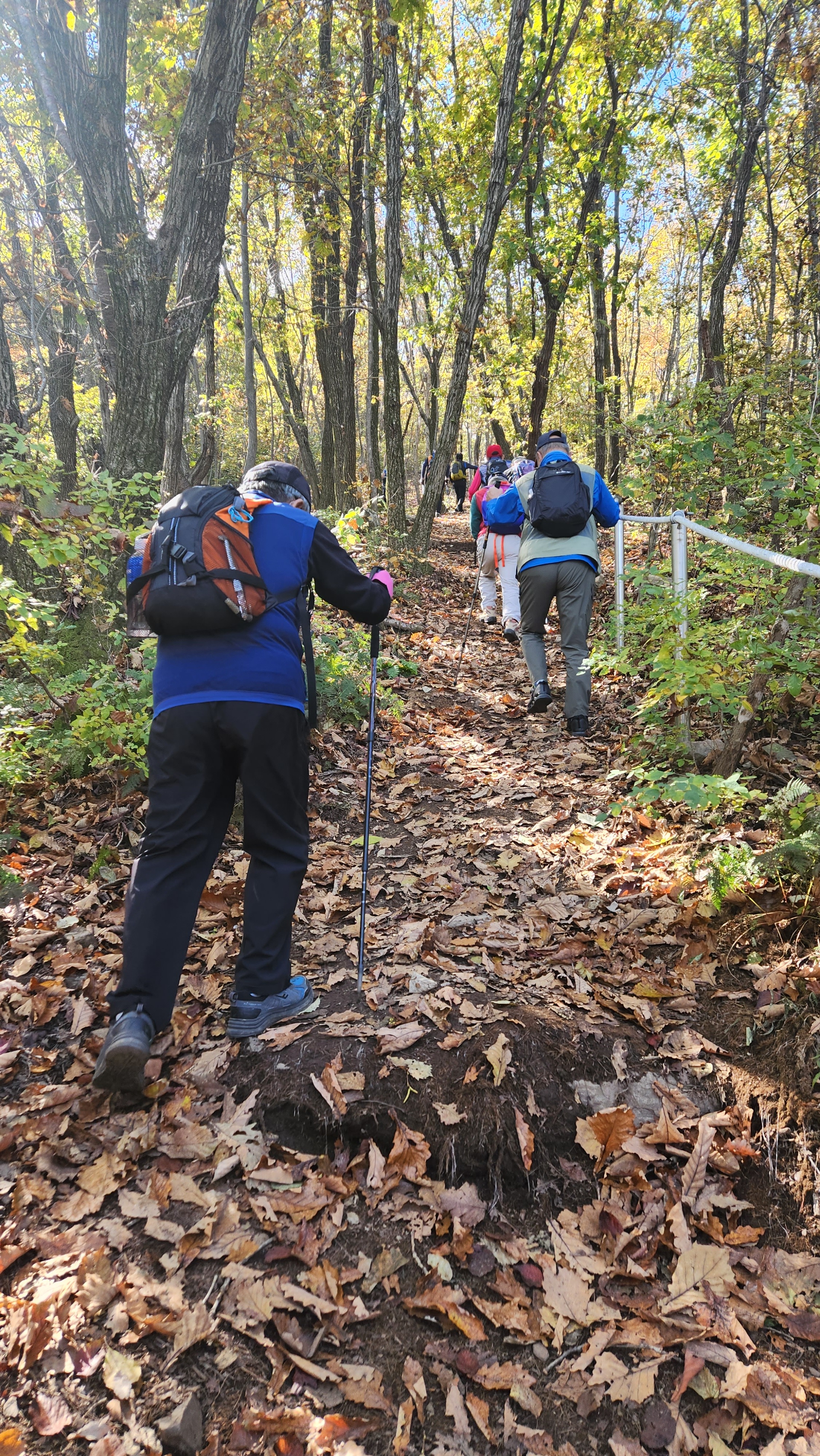 이찬철 동문은 성유경, 김홍찬 회장과는 인연이 깊다. 둘이서 반갑게 인사를 나누웠다. 이찬철 동문은 소요산 근처에 있는 처형의 밭(100평)에 사과나무 10그루를 자비로 심어주기 위해 이곳에 왔다고 하였다. 오늘 산행은 난이도가 높은 힘든 산행이었다. 그럼에도 불구하고 회원들은 힘든 내색없이 모두 밝은 표정들이었다. 단풍는 아직 소식이 없지만 내주 이후에는 화려한 색갈로 수놓을 것으로 보인다. 노년에 동기생들과 함께 여인동락하면 즐거움이 가득하고 행복이 배가된다. 대열동호회 중에서 가장 힘든 직책을 수행하고 있는 김홍찬 회장이 정말 자랑스럽고 존경스럽다.