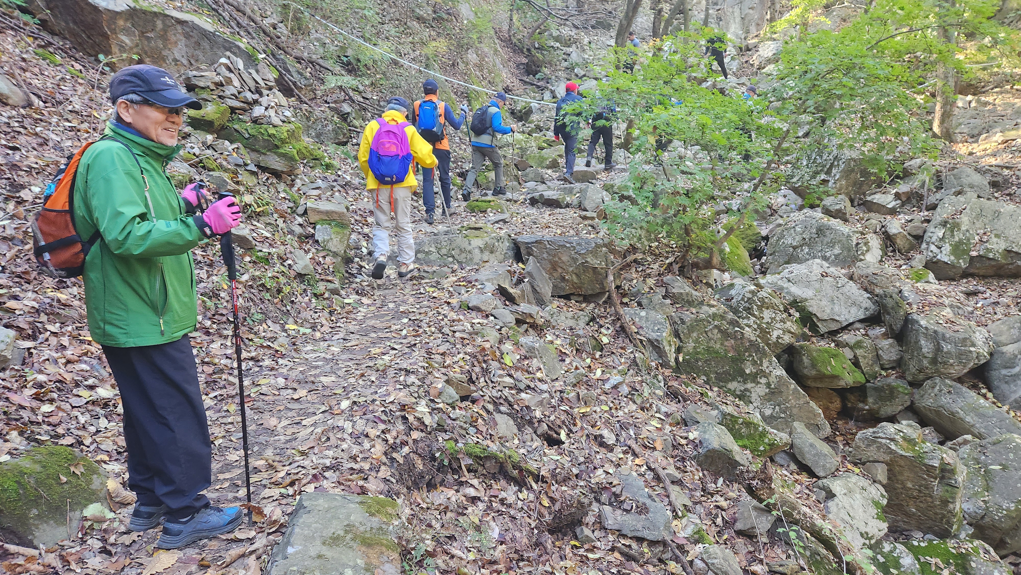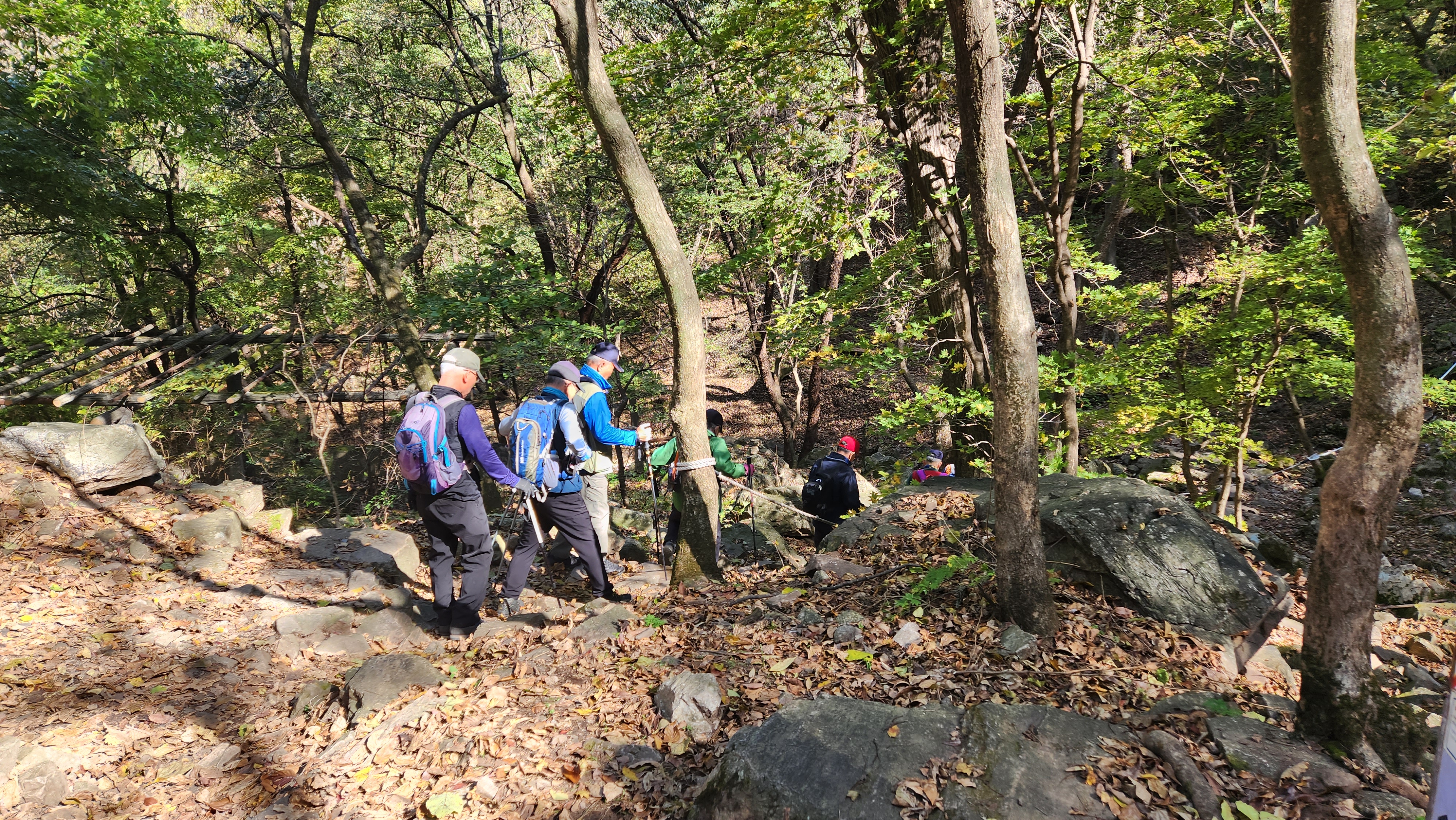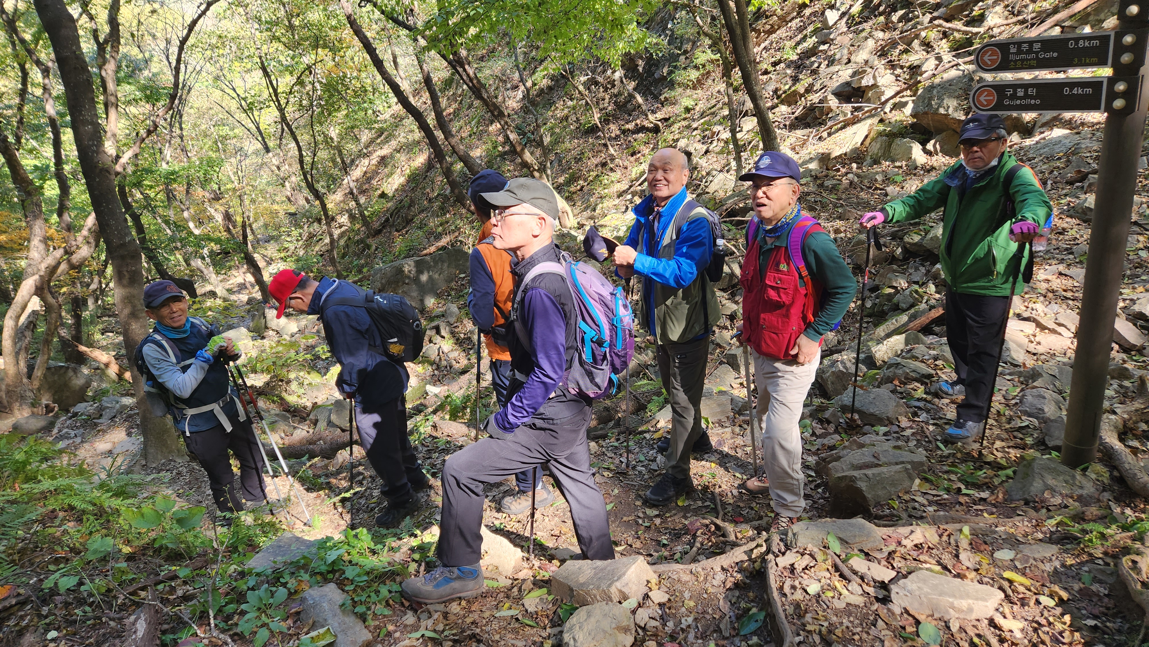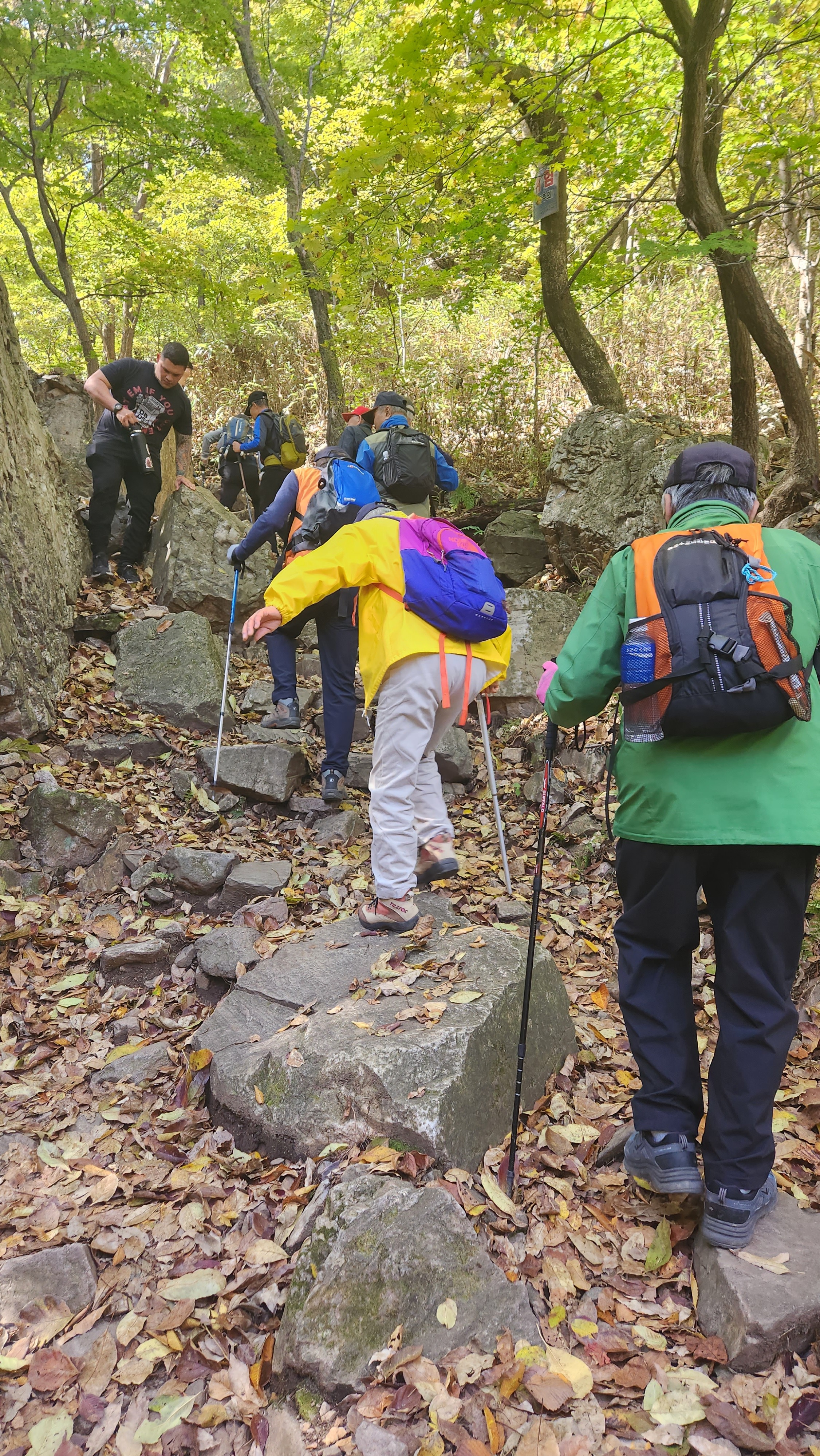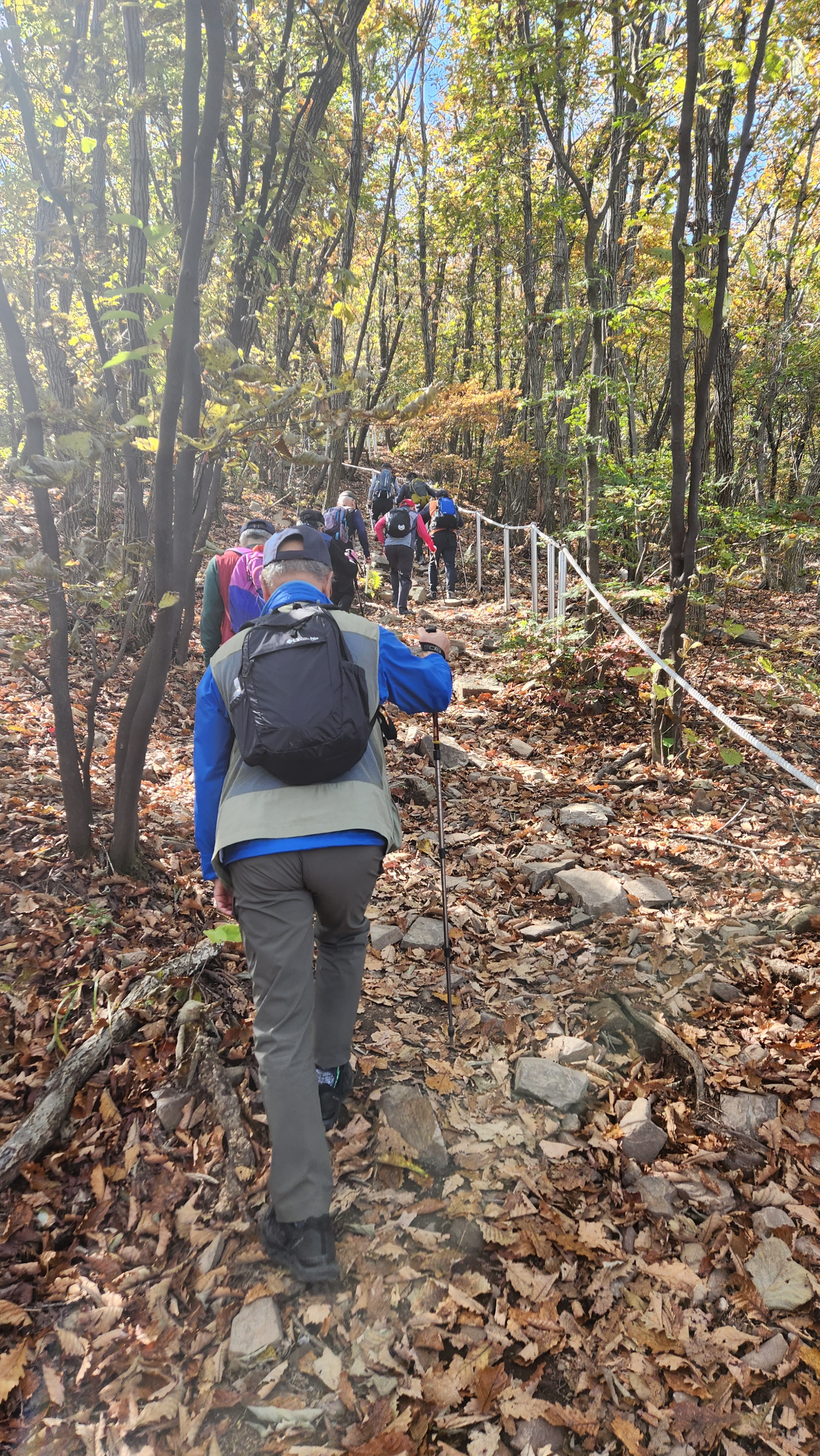 이찬철 동문은 성유경, 김홍찬 회장과는 인연이 깊다. 둘이서 반갑게 인사를 나누웠다. 이찬철 동문은 소요산 근처에 있는 처형의 밭(100평)에 사과나무 10그루를 자비로 심어주기 위해 이곳에 왔다고 하였다. 오늘 산행은 난이도가 높은 힘든 산행이었다. 그럼에도 불구하고 회원들은 힘든 내색없이 모두 밝은 표정들이었다. 단풍는 아직 소식이 없지만 내주 이후에는 화려한 색갈로 수놓을 것으로 보인다. 노년에 동기생들과 함께 여인동락하면 즐거움이 가득하고 행복이 배가된다. 대열동호회 중에서 가장 힘든 직책을 수행하고 있는 김홍찬 회장이 정말 자랑스럽고 존경스럽다.