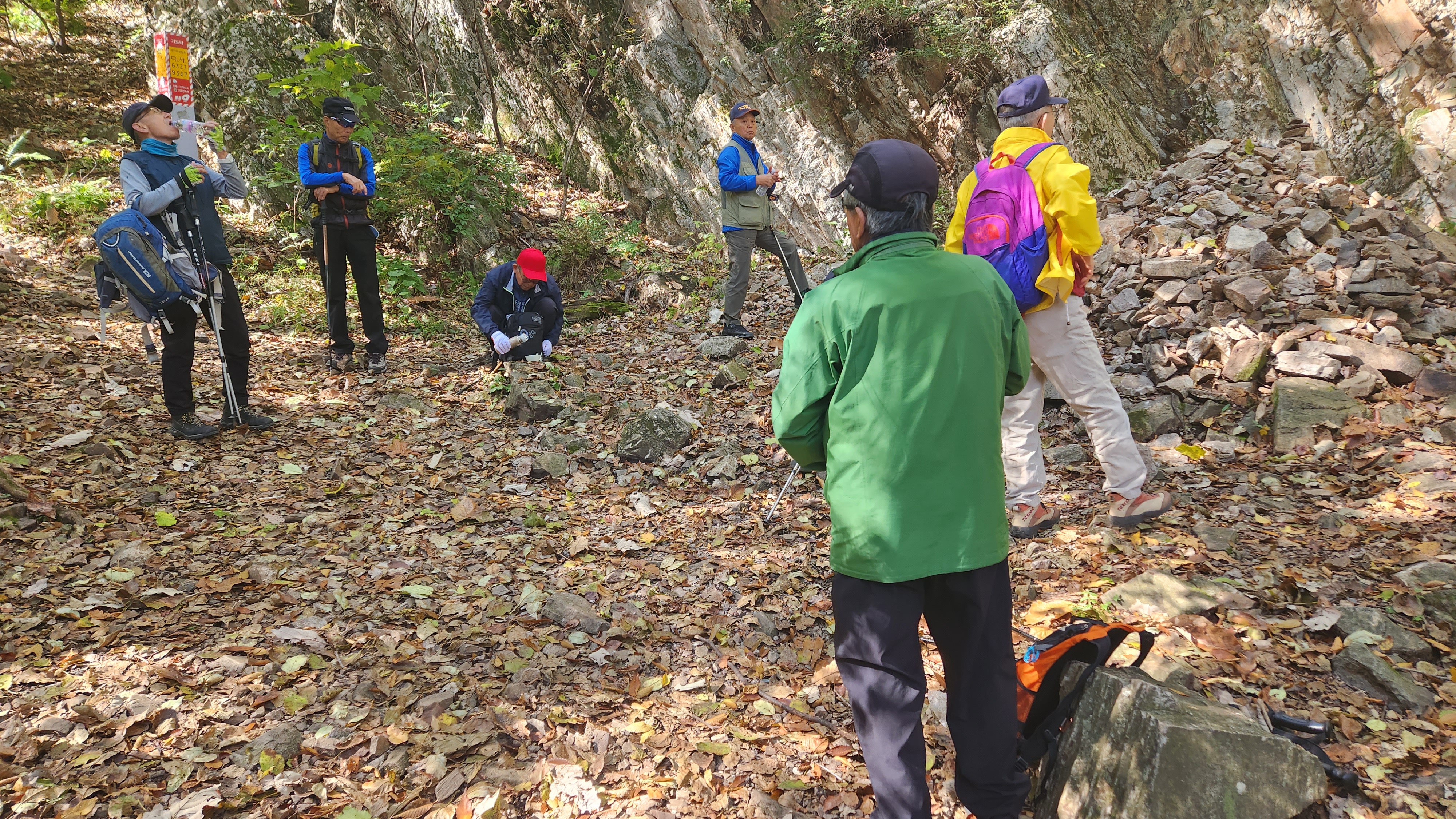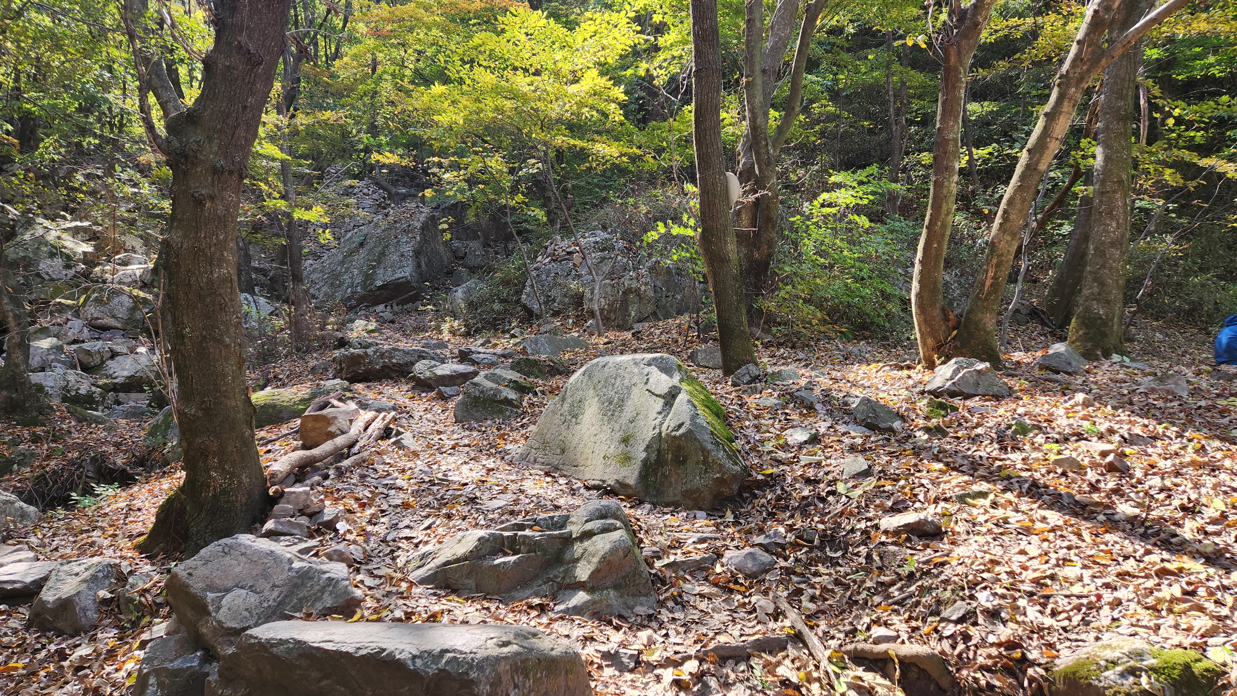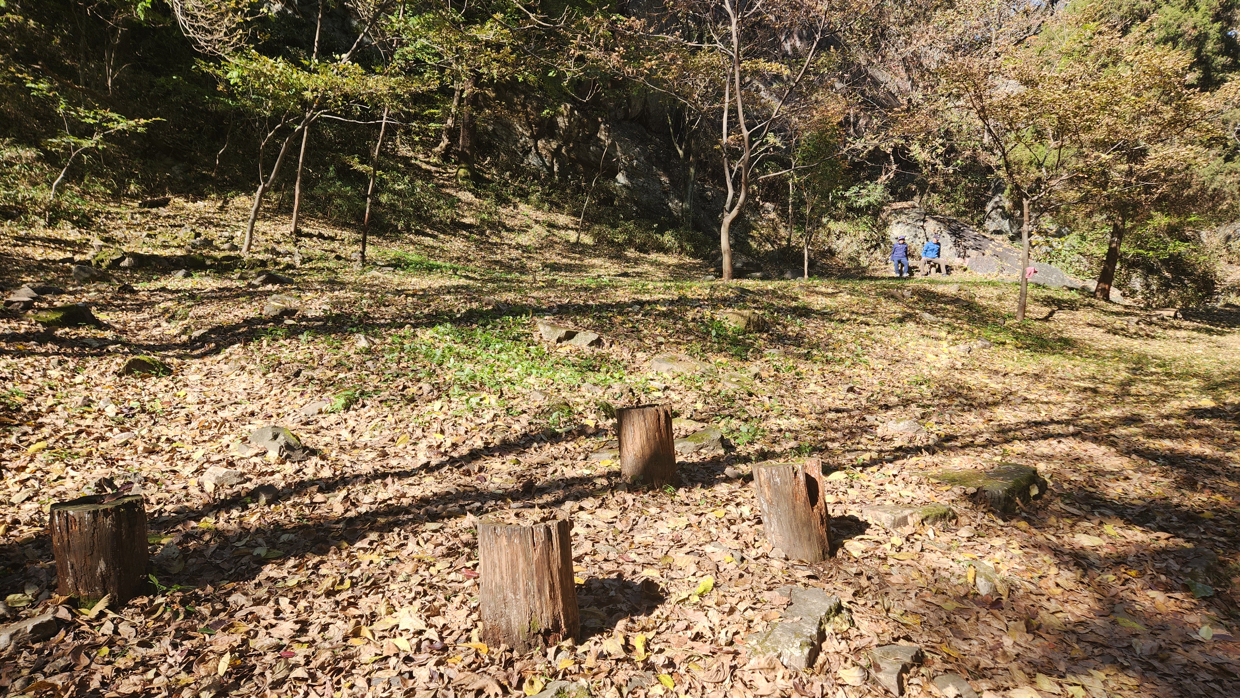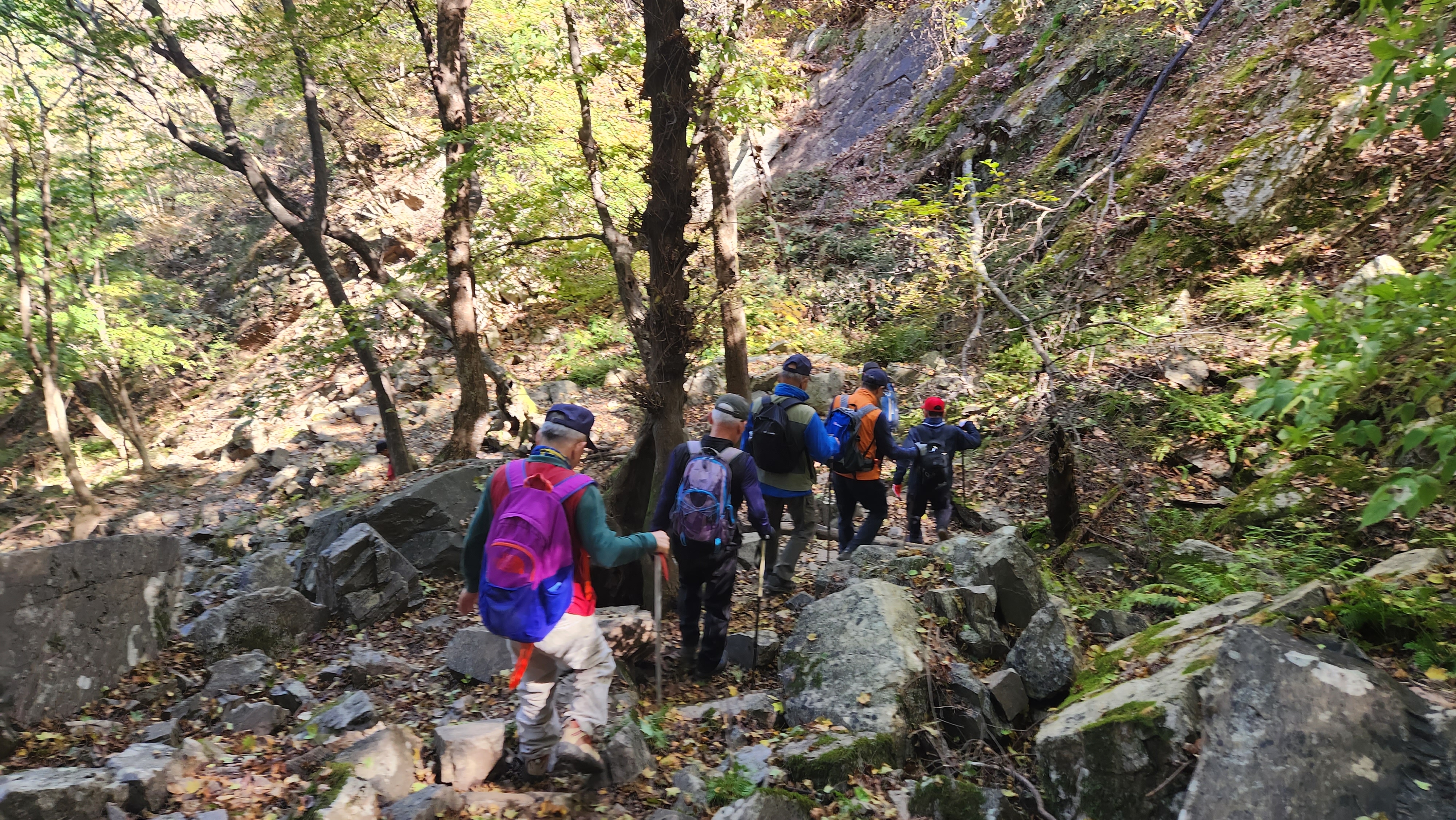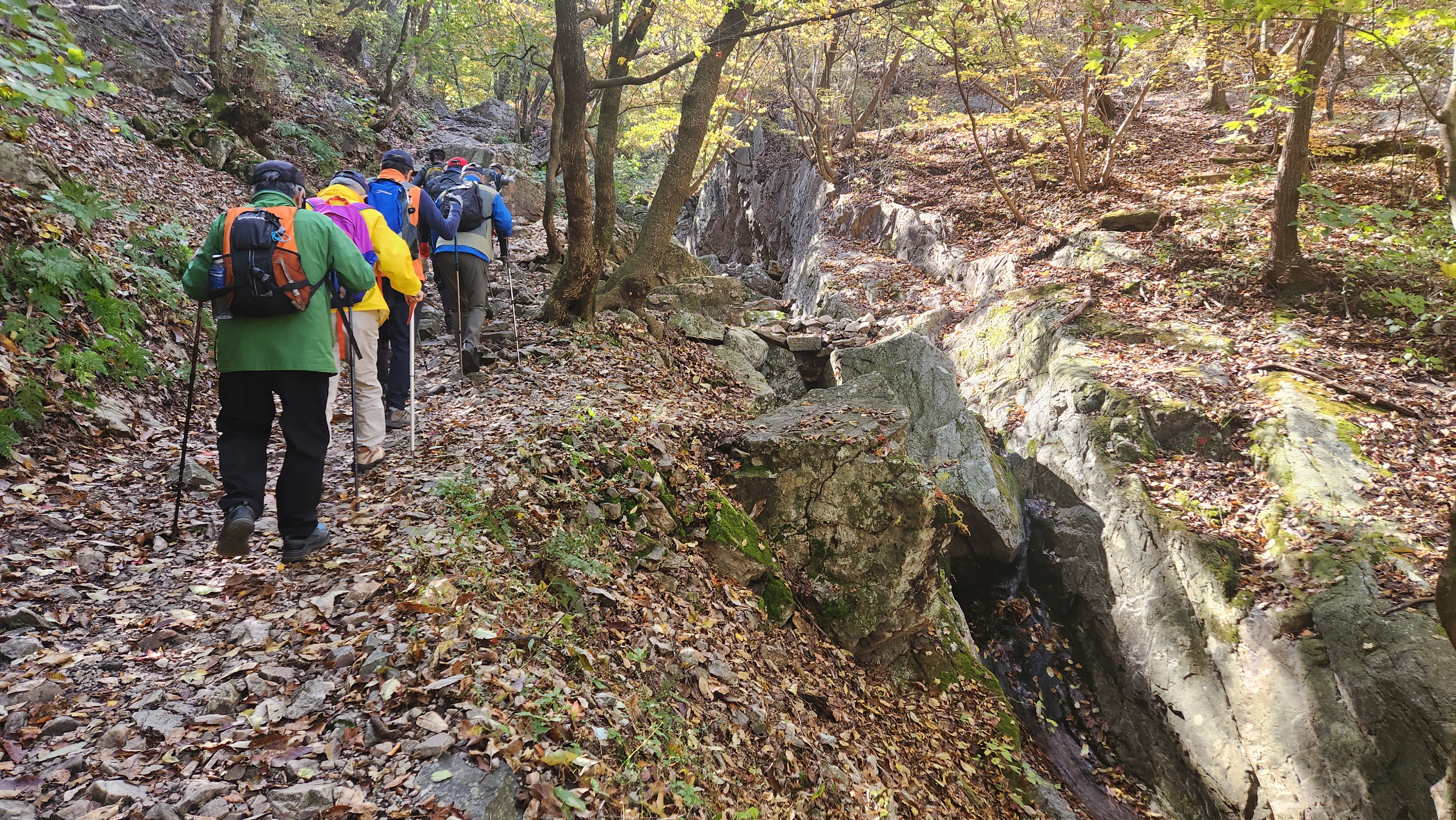 하산은 샘터하산로, 샘터, 구절터로 가는 방향이다. 공주봉에서 내리막길을 따라 450m에 이르면 샘터하산로가 나온다. 올라왔던 등산로보다는 경사가 더 급하고 더 거칠은 길이다. 개인 간격 3m를 유지하면서 석신명하 듯 조심스럽게 이동한다. 급경사 내리막길은 힘이 들지 않지만 언제나 위험이 도사리고 있다. 산행시 대부분 사고는 내리막길에서 발생한다. 김홍찬 회장은 안전에 유념하라고 심심당부한다. 샘터하산로에서 구절터까지는 1km로 지루하게 느껴지고 숨소리도 작아진다. 구절터에 가까이 다가갈 수록 가냘픈 계곡물이 흐르고 있었다.