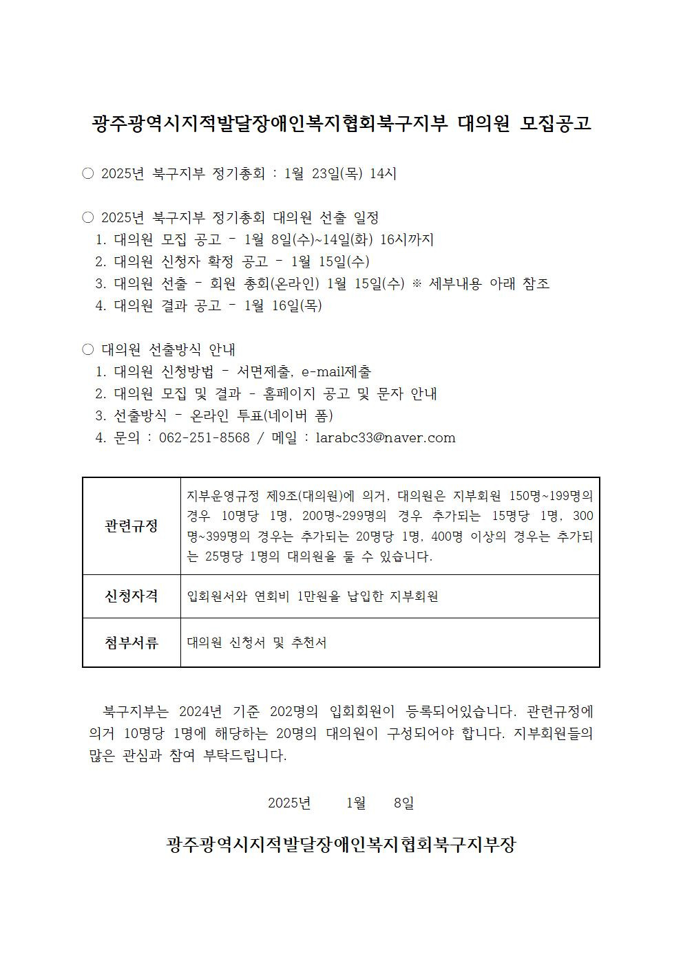 2025년 광주지적발달장애인복지협회북구지부 대의원 모집공고 작성자JJong|작성시간25.01.08|조회수117 목록 댓글 0 글자크기 작게가 글자크기 크게가 북구지부 대의원 신청서.hwp67.50KB북구지부 대의원 추천서.hwp82.50KB 첨부파일첨부된 파일이 3개 있습니다. jpg 파일 북구지부 대의원 모집공고문(수정본)001.jpg 다운로드 hwp 파일 북구지부 대의원 신청서.hwp 다운로드 hwp 파일 북구지부 대의원 추천서.hwp 다운로드 다음검색 현재 게시글 추가 기능 열기 북마크 신고 센터로 신고 댓글 댓글 0 댓글쓰기 답글쓰기 댓글 리스트