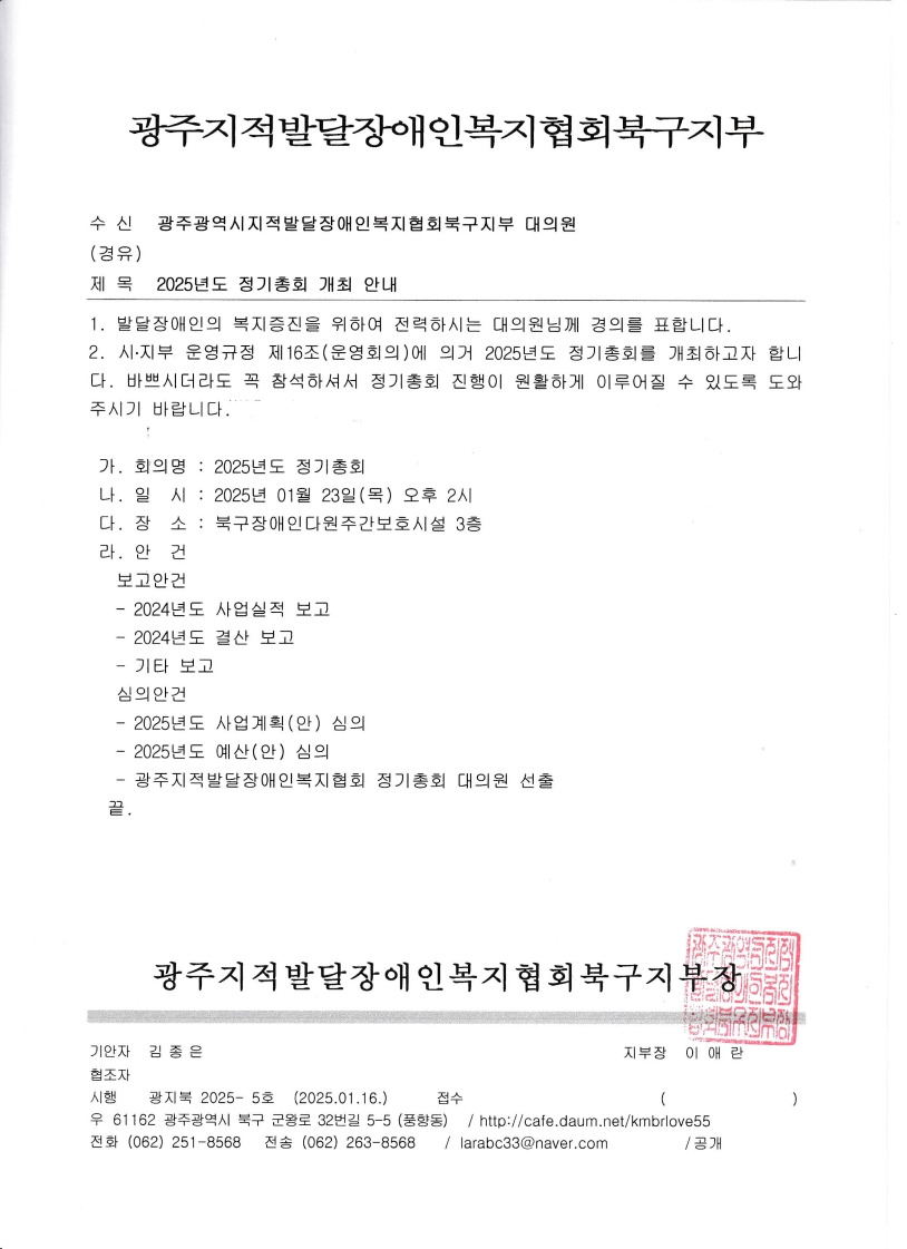 광주광역시지적발달장애인복지협회북구지부 2025년도 정기총회 개최 안내 작성자JJong|작성시간25.01.16|조회수77 목록 댓글 0 글자크기 작게가 글자크기 크게가 다음검색 현재 게시글 추가 기능 열기 북마크 신고 센터로 신고 댓글 댓글 0 댓글쓰기 답글쓰기 댓글 리스트