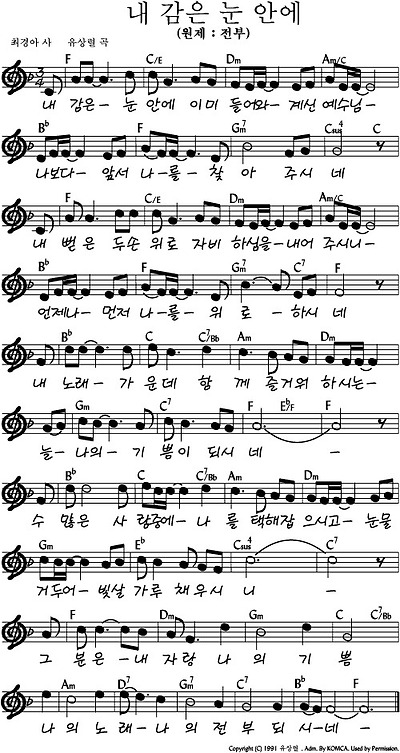 전부 (악보+찬양+가사) 작성자임동신|작성시간09.03.25|조회수902 목록 댓글 0 글자크기 작게가 글자크기 크게가 찬양 : 소리엘 1집 내 감은 눈 안에 이미 들어와 계신 예수님나 보다 앞서 나를 찾아 주시네 내 뻗은 두 손 위로 자비하심을 내어 주시니언제나 먼저 나를 위로 하시네내 노래 가운데 함께 즐거워하시는늘 나의 기쁨이 되시네수 많은 사람중에 나를 택해 잡으시고 눈물 거두어 빛살가루 채우시니그 분은 내 자랑 나의 기쁨 나의 노래 나의 전부 되시네 <간주> 내 뻗은 두 손 위로 자비하심을 내어 주시니언제나 먼저 나를 위로 하시네내 노래 가운데 함께 즐거워하시는늘 나의 기쁨이 되시네수 많은 사람중에 나를 택해 잡으시고 눈물 거두어 빛살가루 채우시니그 분은 내 자랑 나의 기쁨 나의 노래 나의 전부 되시네 나의 전부 되시네 다음검색 현재 게시글 추가 기능 열기 북마크 공유하기 신고 센터로 신고 댓글 댓글 0 댓글쓰기 답글쓰기 댓글 리스트