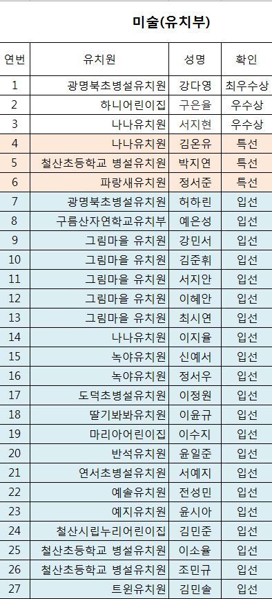2017학생미술·서예대회_수상내역(미술-유치부) 작성자박인옥|작성시간17.04.24|조회수96 목록 댓글 0 글자크기 작게가 글자크기 크게가 입상을 축하드립니다^^ 다음검색 현재 게시글 추가 기능 열기 북마크 공유하기 신고 센터로 신고 댓글 댓글 0 댓글쓰기 답글쓰기 댓글 리스트