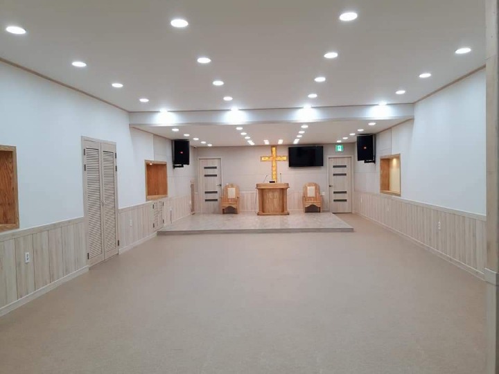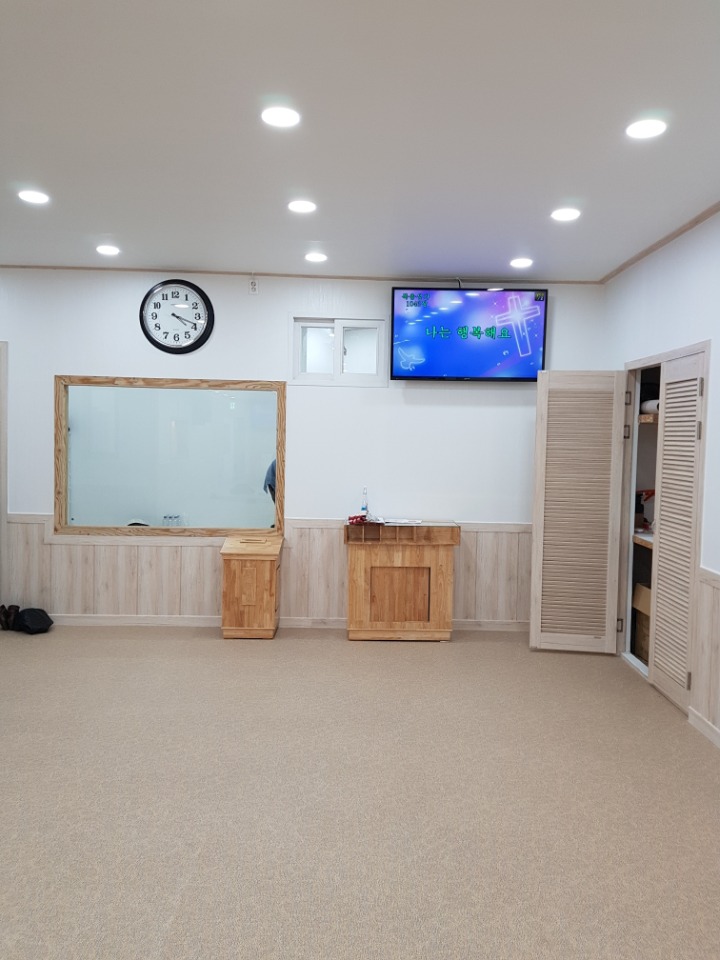 앞쪽메이 TV와 뒤면에 모니터TV 를 설비해 멋지고 선명한화질로 주님의 말씀이 보일수있도록 하였습니다