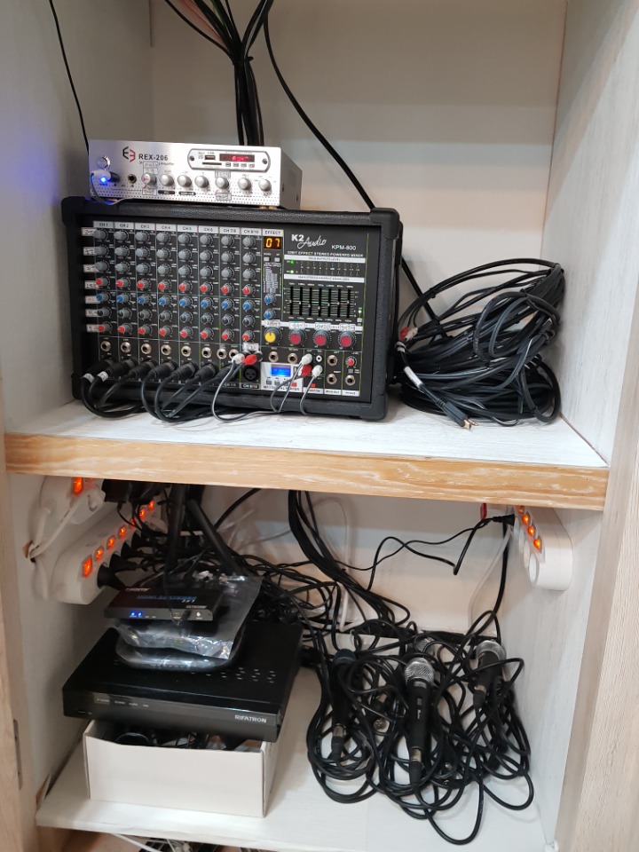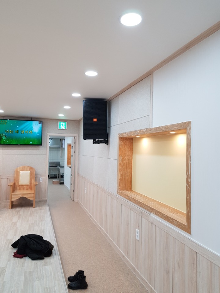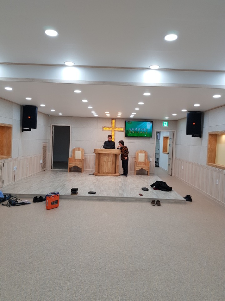 파워더엠프와.15인치스피커 .구즈넥(강대상)마이크. 사회자/보컬용마이크.마이크시스템.유아실엠프와 스피커을 설비해 아름답고 멋진음질로 주님을 찬양드릴수 있도록 하였습니다