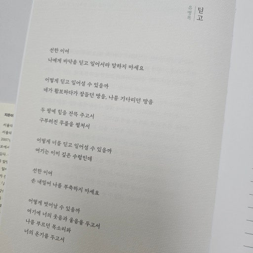 감상평 : 이 시는 일어서라는 말로는 닿지 않는 깊은 부분을 섬세하게 보여주는 시입니다. 제가 이 시를 선택한 이유는 쉽게 말해지는 위로의 무게를 다시 생각하게 되었기 때문입니다. ‘일어서라’는 말보다 함께 그 자리에 머무는 마음이 더 큰 위로가 될 수 있다는 부분이 인상깊었습니다.