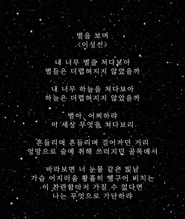 20211705 이승헌/ 별을 보며 - 이성선 작성자이승헌|작성시간25.10.14|조회수36 목록 댓글 0 글자크기 작게가 글자크기 크게가 바쁜 일상 속에서도 하늘을 보며 별을 통해 위로와 사색의 깊이를 느낄 수 있던 시였다. 다음검색 현재 게시글 추가 기능 열기 북마크 공유하기 신고 센터로 신고 댓글 댓글 0 댓글쓰기 답글쓰기 댓글 리스트