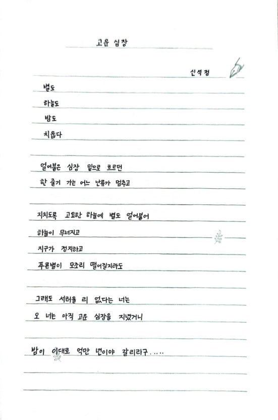 20251578 유연우 - 신석정 고운심장 작성자20251578 유연우|작성시간25.10.16|조회수48 목록 댓글 0 글자크기 작게가 글자크기 크게가 고운 심장’은 세상의 거칠음 속에서도 순수함을 잃지 않으려는 마음을 그린 시다. 신석정의 따뜻한 언어가 마음 깊은 곳의 인간다움을 일깨운다. 읽고 나면 고운 마음으로 세상을 바라보고 싶어진다. 다음검색 현재 게시글 추가 기능 열기 북마크 공유하기 신고 센터로 신고 댓글 댓글 0 댓글쓰기 답글쓰기 댓글 리스트