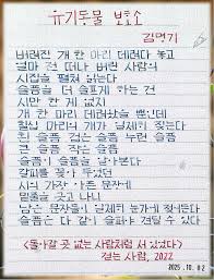 20191664 박건필/ 유기동물보호소-김명기 작성자박건필|작성시간25.10.16|조회수22 목록 댓글 0 글자크기 작게가 글자크기 크게가 버려진 개와 시집을 통해 슬픔의 공감을 표현합니다. 함께 아파하는것이 치유의 시작이라는걸 말하는것 같습니다. 다음검색 현재 게시글 추가 기능 열기 북마크 공유하기 신고 센터로 신고 댓글 댓글 0 댓글쓰기 답글쓰기 댓글 리스트