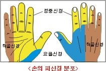 해부신경학적으로 손에는 3개의 피신경(皮神經)이 분포되어 있다. 손등과 손바닥에 분포된 피신경을 살펴보면, 중지 손가락 전체와 약지 손가락의 중간(縱으로 1/2 선)에 정중신경(正中神經)이 연이어 분포되어 있다.