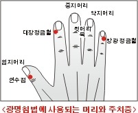 특히, 대표적인 예로 눈병이나 두통에 소지 손가락 손톱 뿌리 외측 <방광 정금혈>을 사혈 하는데, 이 혈은 {광명 수지침 요법}의 경맥을 이용한 대표적인 머리 치료점이다.