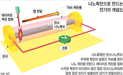 한국인 최원준·한재희·송창식 미국 MIT 연구원과 마이클 스트라노(Strano) MIT 화공학과 교수, 성균관대 기계공학과 홍승현 연구원 등으로 구성된 연구진은 탄소나노튜브에 폭탄의 일종인 TNA를 발라 나노폭탄을 만들고 여기서 전기를 뽑는 데 성공했다고 10일 밝혔다. TNA는 군사용으로 사용하는 폭발력이 강한 화약물질이다. 탄소나노튜브는 탄소 원자로 이뤄진 빨대 모양의 기다란 관이다. 탄소나노튜브는 구리보다 전도성(電導性)에서 1000배나 좋다. 전도성은 전기를 전달하는 성질을 말한다. 탄소나노튜브는 철보다 100배 강해서 차세대 소재로 세계 연구진이 상용화를 위한 연구를 진행 중이다.