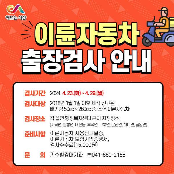서산시가 한국교통안전공단과 함께 관내 읍면 지역에 등록된 이륜자동차를 대상으로 찾아가는 이륜자동차 출장 검사를 시행한다.