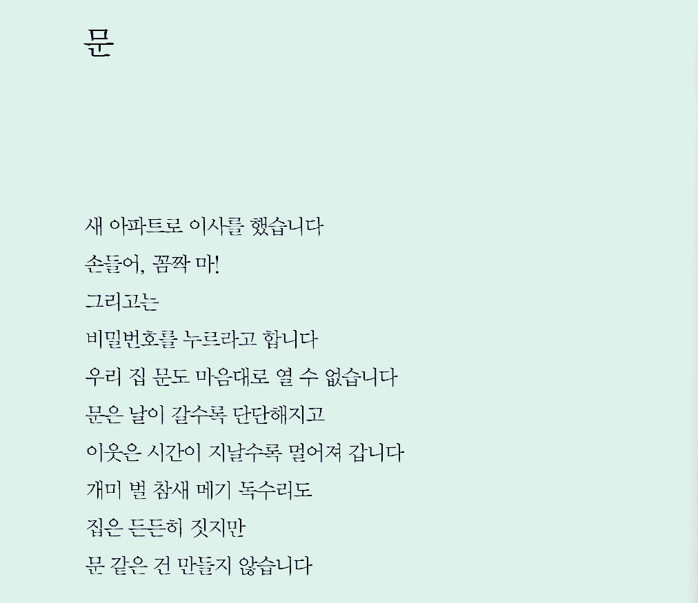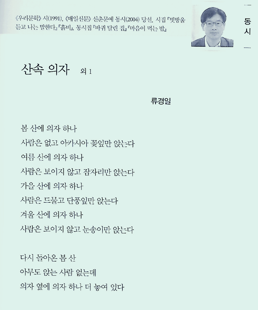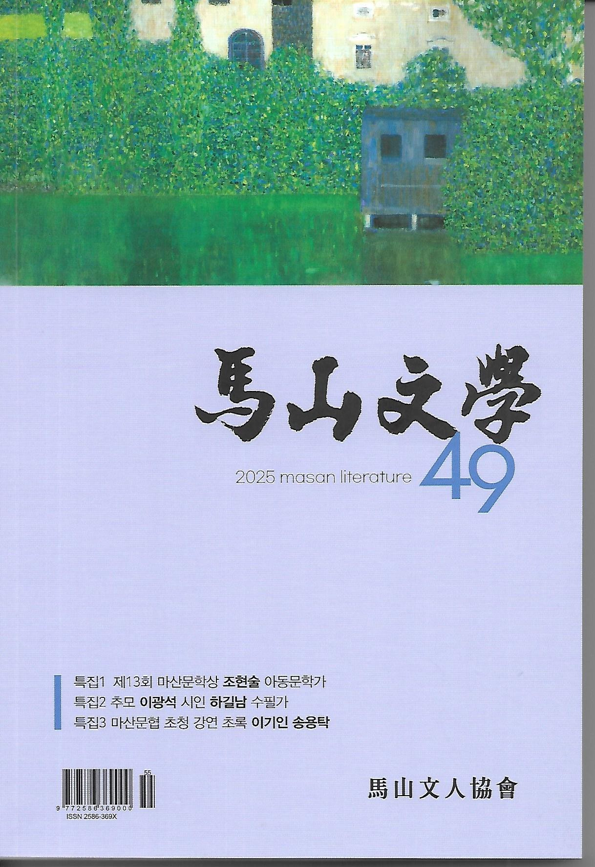 류경일 동시 / 산속 의자 외1 작성자김현우|작성시간25.12.02|조회수30 목록 댓글 0 글자크기 작게가 글자크기 크게가 류경일 동시인이 <마산문학>(2025. 제49집)에동시 "산속 의자 외1"을 발표했다. 동시산속 의자 외1류경일동시가 실린 <마산문학> 49집 다음검색 현재 게시글 추가 기능 열기 북마크 공유하기 신고 센터로 신고 댓글 댓글 0 댓글쓰기 답글쓰기 댓글 리스트