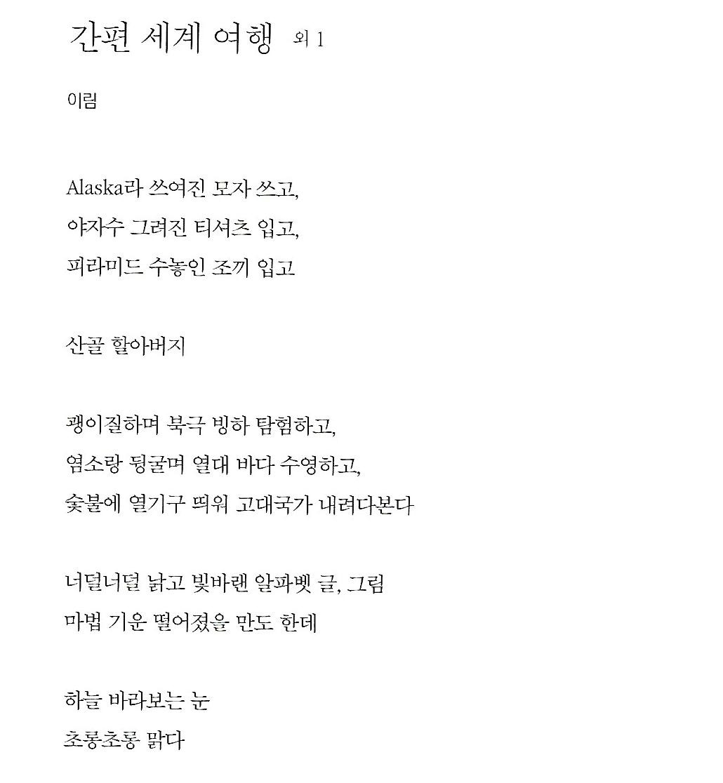 이림 동시 / 간편 세계 여행 외1 작성자김현우|작성시간25.12.17|조회수29 목록 댓글 0 글자크기 작게가 글자크기 크게가 이 림 동시인이 <작업>(2025. 제38집)에동시 "간편 세계 여행 외1"을 발표했다. 동시간편 세계 여행 외1이 림 다음검색 현재 게시글 추가 기능 열기 북마크 공유하기 신고 센터로 신고 댓글 댓글 0 댓글쓰기 답글쓰기 댓글 리스트