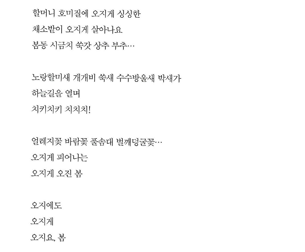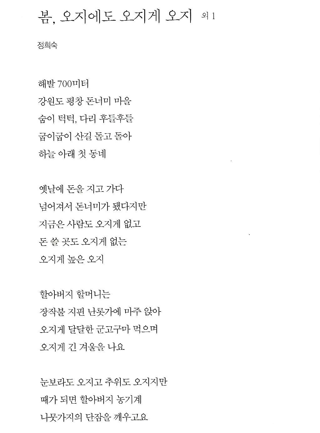 정희숙 동시 / 봄, 오지에도 오지게 오지 외1 작성자김현우|작성시간25.12.19|조회수28 목록 댓글 0 글자크기 작게가 글자크기 크게가 정희숙 동시인이 <작업>(2025. 제38집)에동시 "봄, 오지에도 오지게 오지 외1"을 발표했다. 동시봄, 오지에도 오지게 오지 외1정희숙 다음검색 현재 게시글 추가 기능 열기 북마크 공유하기 신고 센터로 신고 댓글 댓글 0 댓글쓰기 답글쓰기 댓글 리스트