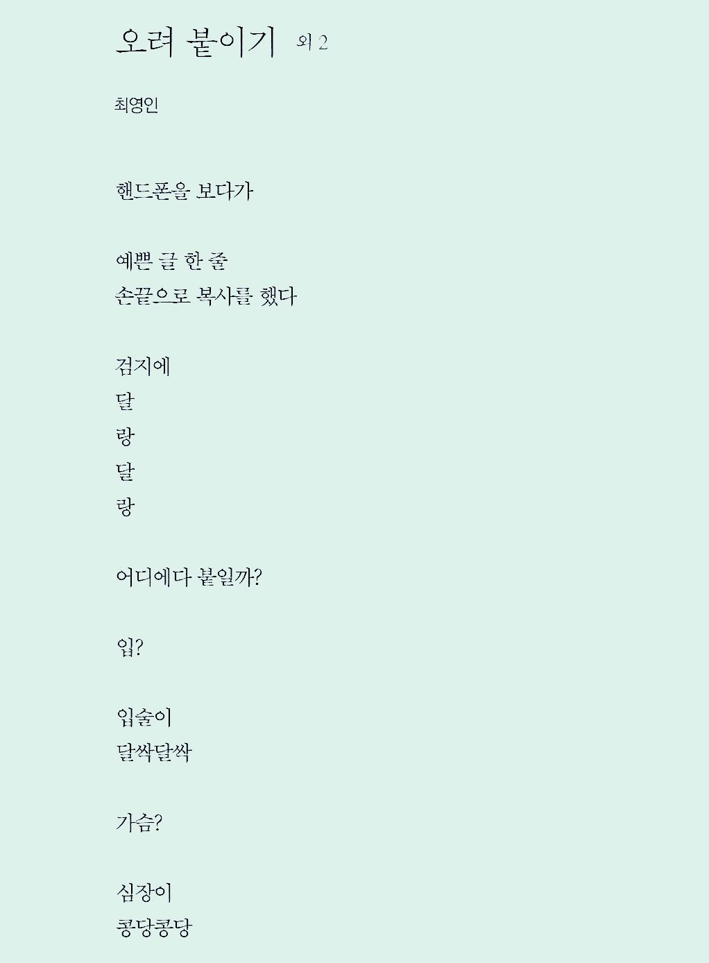 최영인 동시 / 오려 붙이기 외1 작성자김현우|작성시간25.12.19|조회수30 목록 댓글 0 글자크기 작게가 글자크기 크게가 최영인 동시인이 <작업>(2025. 제38집)에동시 "오려 붙이기 외1"을 발표했다. 동시오려 붙이기 외1최영인 다음검색 현재 게시글 추가 기능 열기 북마크 공유하기 신고 센터로 신고 댓글 댓글 0 댓글쓰기 답글쓰기 댓글 리스트