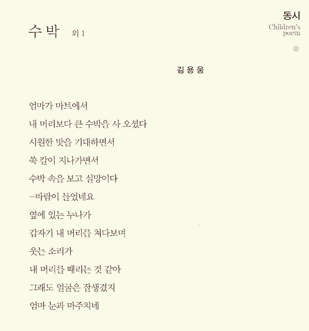 김용웅 동시 / 수박 외1 작성자김현우|작성시간25.12.24|조회수25 목록 댓글 0 글자크기 작게가 글자크기 크게가 김용웅 동시인이 <김해문학>(2025. 제39집)에동시 "수박 외1"을 발표했다. 동시수박 외1김용웅 다음검색 현재 게시글 추가 기능 열기 북마크 공유하기 신고 센터로 신고 댓글 댓글 0 댓글쓰기 답글쓰기 댓글 리스트