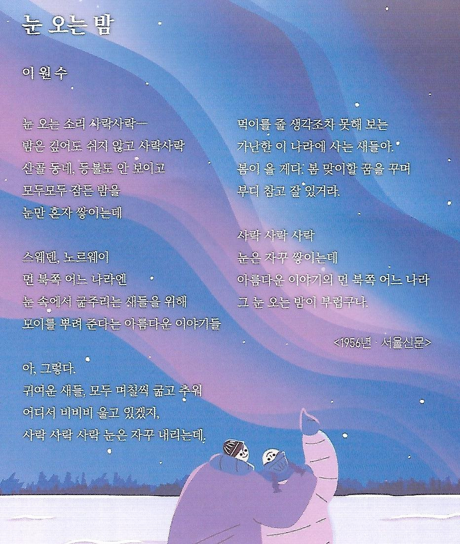동시 눈 오는 밤 / 이원수 작성자김현우|작성시간25.12.11|조회수25 목록 댓글 0 글자크기 작게가 글자크기 크게가 <꽃대궐>(2025. 12월)에 이원수 선생 동시 "눈 오는 밤"이 실렸다. 동시눈 오는 밤이원수 다음검색 현재 게시글 추가 기능 열기 북마크 공유하기 신고 센터로 신고 댓글 댓글 0 댓글쓰기 답글쓰기 댓글 리스트