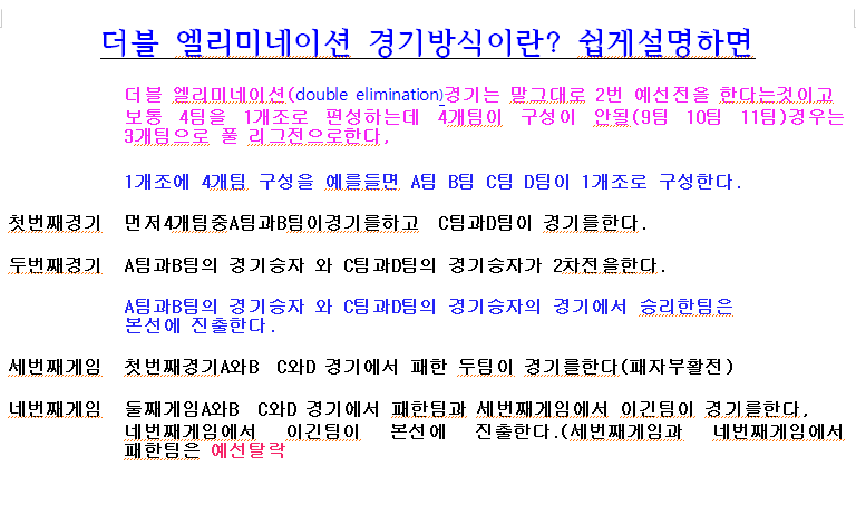 더블엘리미네이션(double elimination) 경기방식이란 ? 작성시간15.09.30|조회수140 목록 댓글 0 글자크기 작게가 글자크기 크게가 더블엘리미네이션(double elimination) 경기방식이란 ? 다음검색 현재 게시글 추가 기능 열기 북마크 신고 센터로 신고 댓글 댓글 0 댓글쓰기 답글쓰기 댓글 리스트