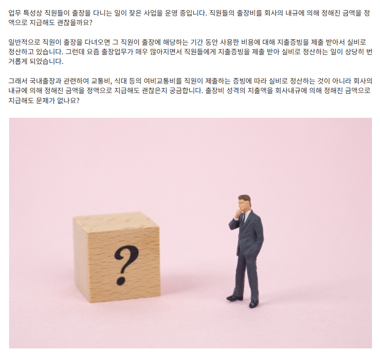 출장비, 사내 규정으로 정액 지급해도 괜찮을까? 작성자多心|작성시간25.02.17|조회수13 목록 댓글 0 글자크기 작게가 글자크기 크게가 다음검색 현재 게시글 추가 기능 열기 북마크 공유하기 신고 센터로 신고 댓글 댓글 0 댓글쓰기 답글쓰기 댓글 리스트