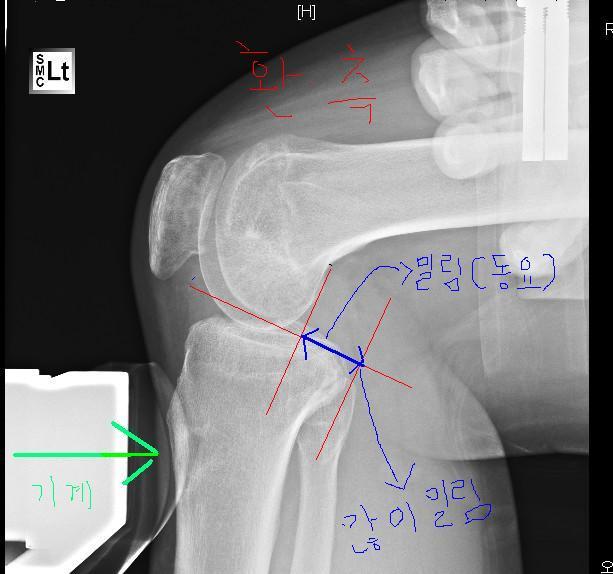 각 엑스레이사진에서 선을 그어서 파란색선 즉 밀리는 부부을 측정하고 mm수를 의사들이 잽니다.