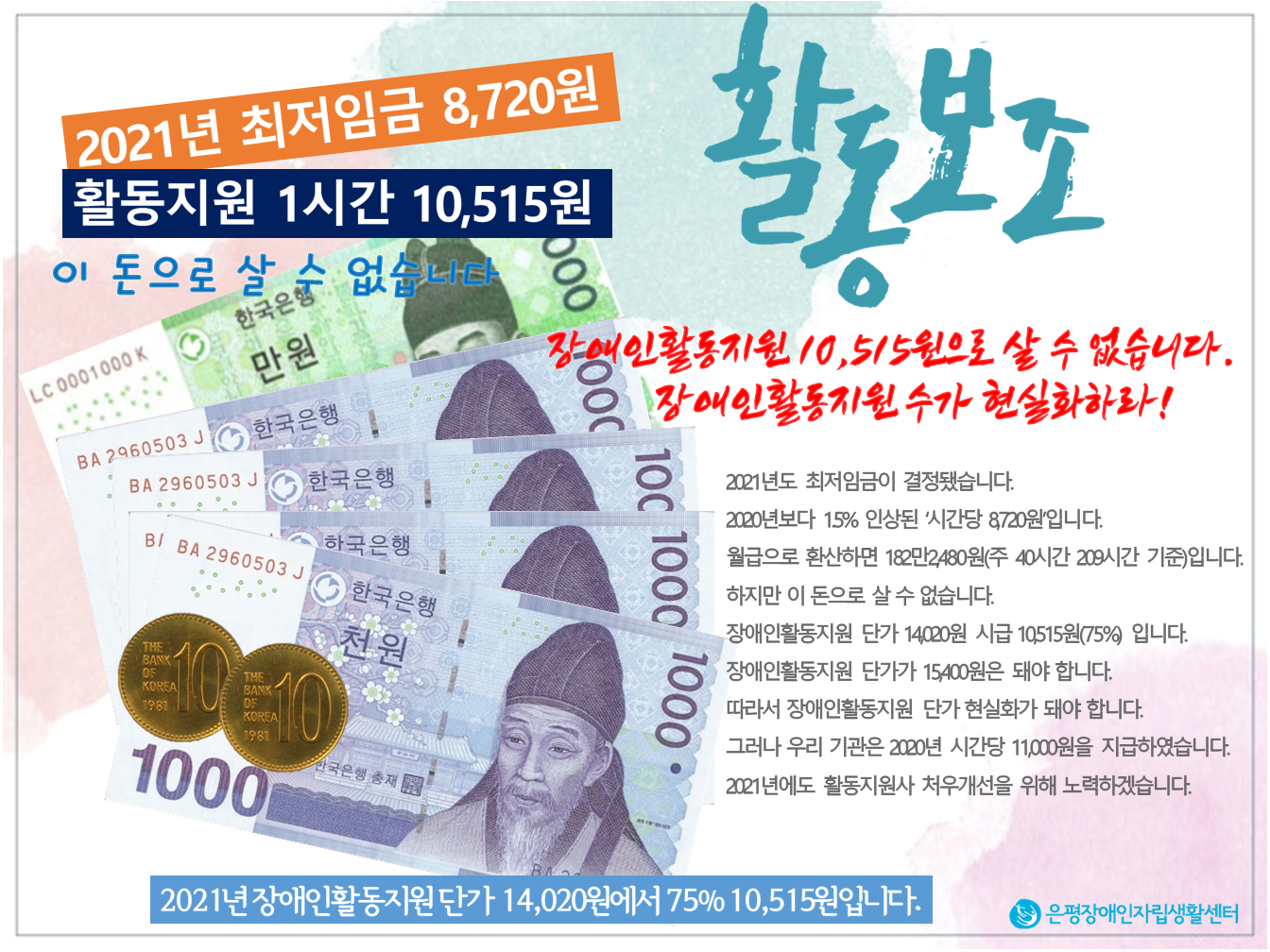 하지만 우리 은평장애인자립생활센터 2020년에 어려운 상황에서도 이미 시급 11,000원을 지급하였습니다.