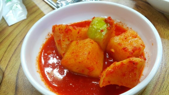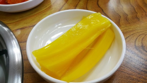 주문한지 얼마 안돼서 물과 기본 반찬들이 나오기 시작했는데 쫌 특이한 점은 단무지 모양이였습니다.