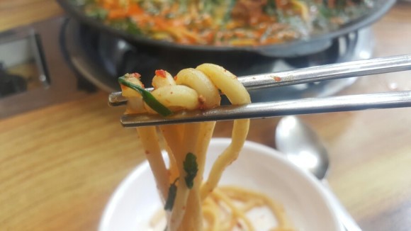닭갈비를 시킬때 사리는 우동사리로 시켰는데 아예 처음에 나올때부터 이렇게 한켠에 얹어서 나왔습니다.