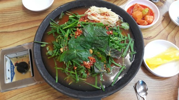 그리고 철판에서는 양배추와 몇몇 야채들도 같이 볶아내는 반면에 이 물닭갈비에는 미나리가 들어가서 맛과 풍미가 아주 좋았네요~