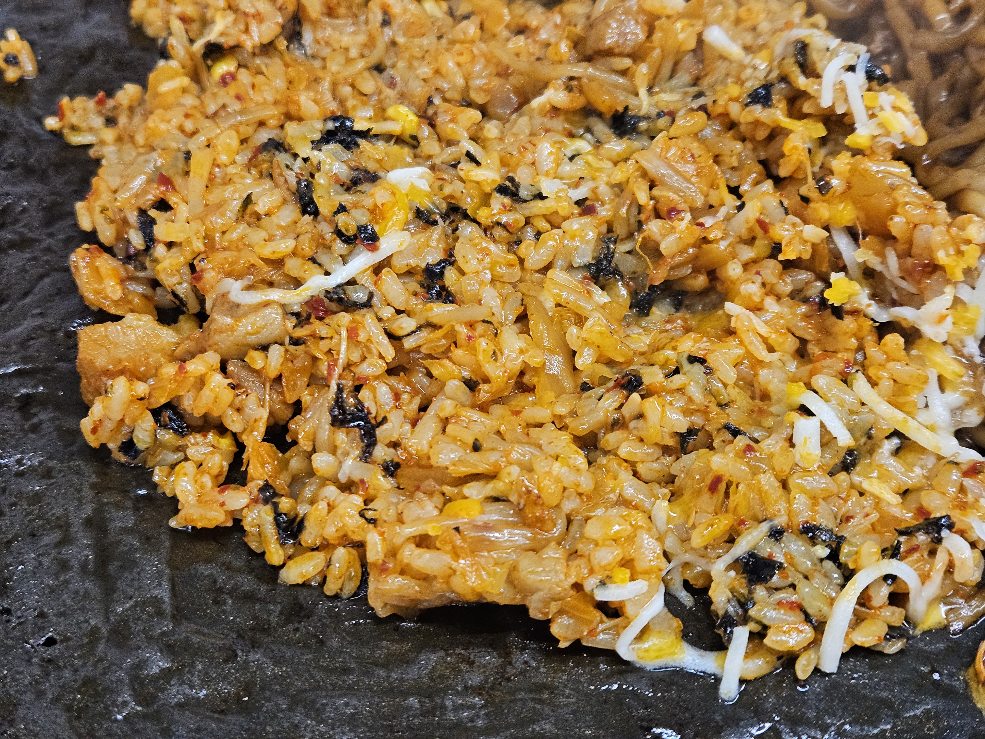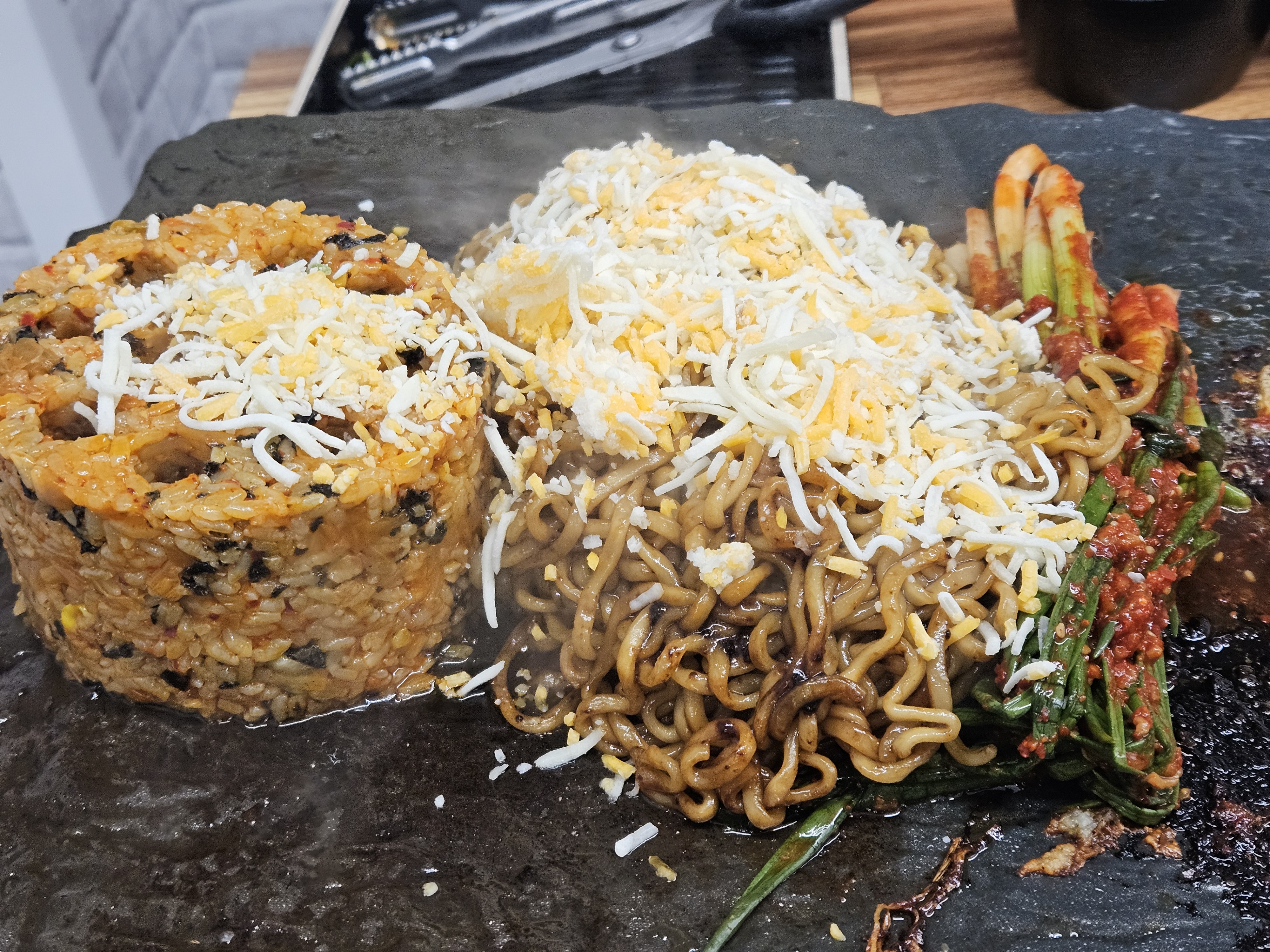 돌판위로 연탄볶음밥과 짜파게티를 올리고 치즈를 뿌려주십니다.
