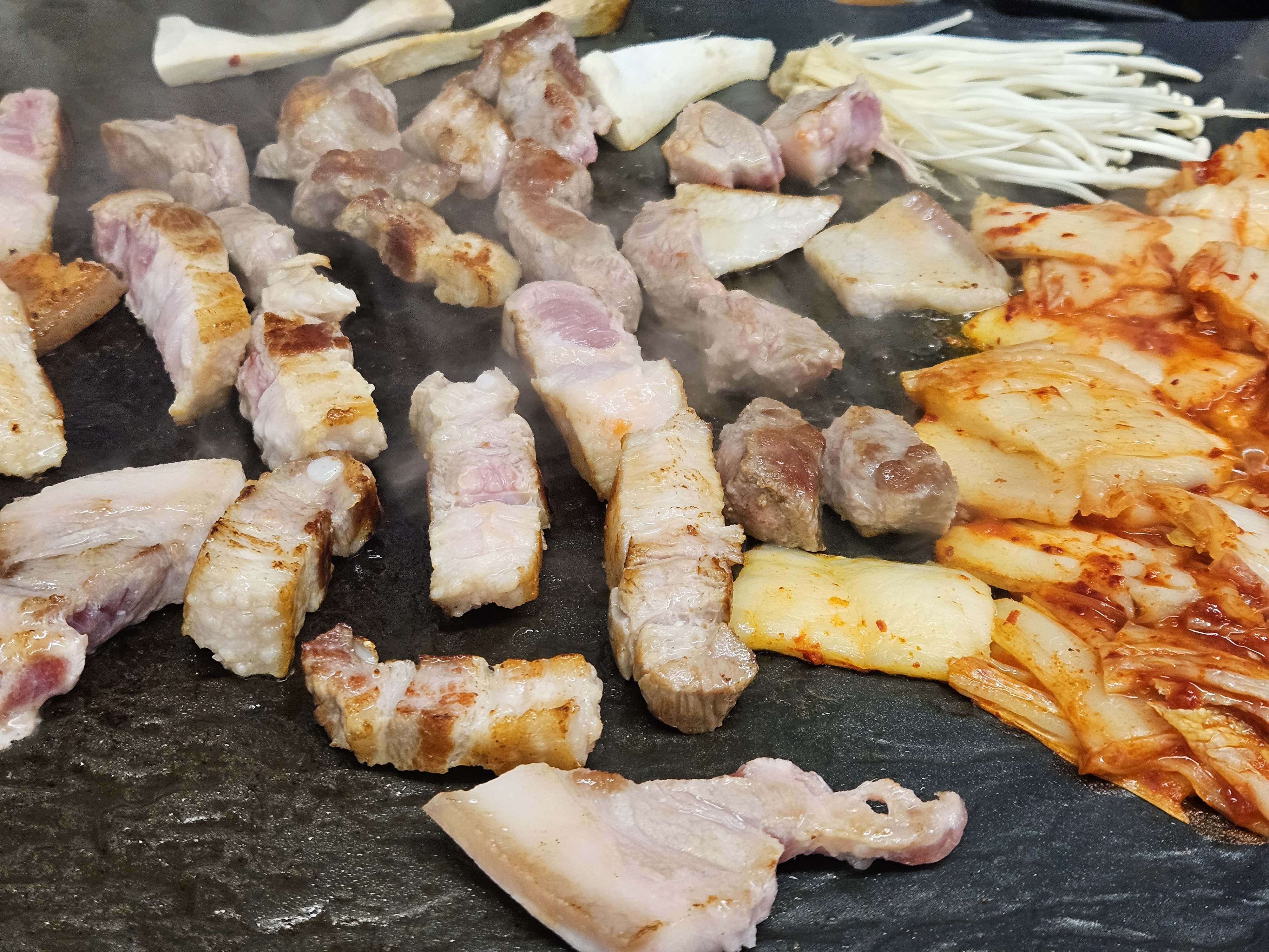 고기기름이 돌판을 코팅하면 김치와 버섯도 올려줍니다.