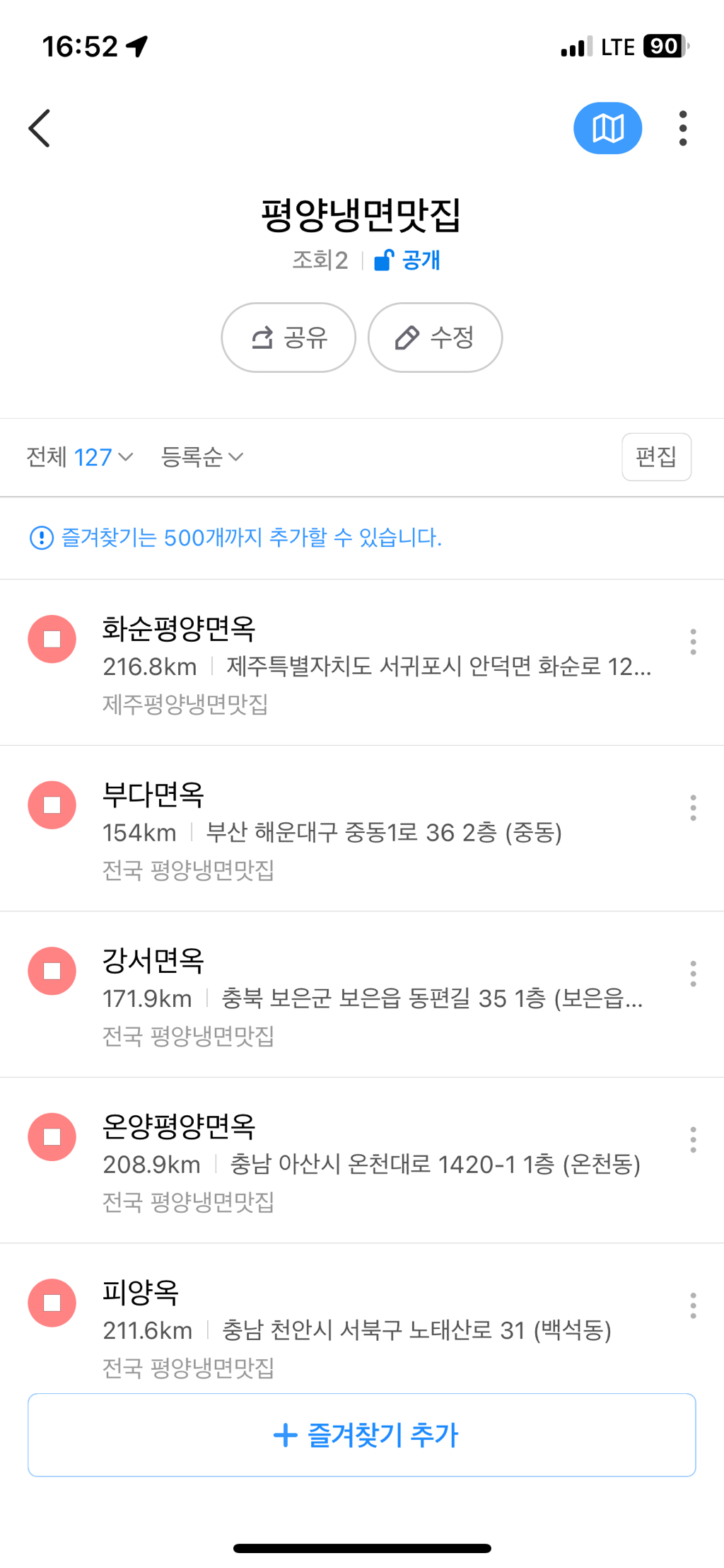 전체 127곳의 평양냉면 맛집을 지도에 마킹하고