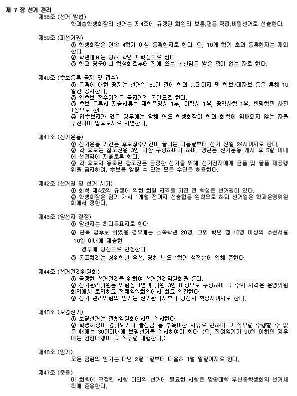 # 회칙 7장 40조 제출 서류는 재학증명서 1부, 공약사항 1부, 반명함판사진 1장, 이력서를 대신한 학생회 조직도 1부