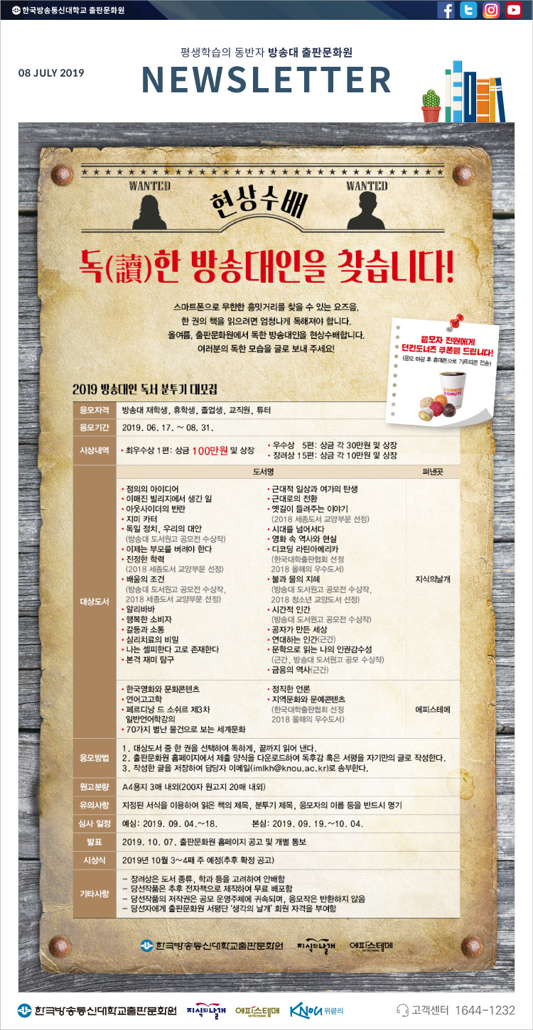 현상수배, 독(讀)한 방송대인을 찾습니다! 2019 방송대인 독서 분투기 대모집 작성자임진선(대전,충남21대)|작성시간19.07.19|조회수6 목록 댓글 0 글자크기 작게가 글자크기 크게가 다음검색 현재 게시글 추가 기능 열기 북마크 공유하기 신고 센터로 신고 댓글 댓글 0 댓글쓰기 답글쓰기 댓글 리스트