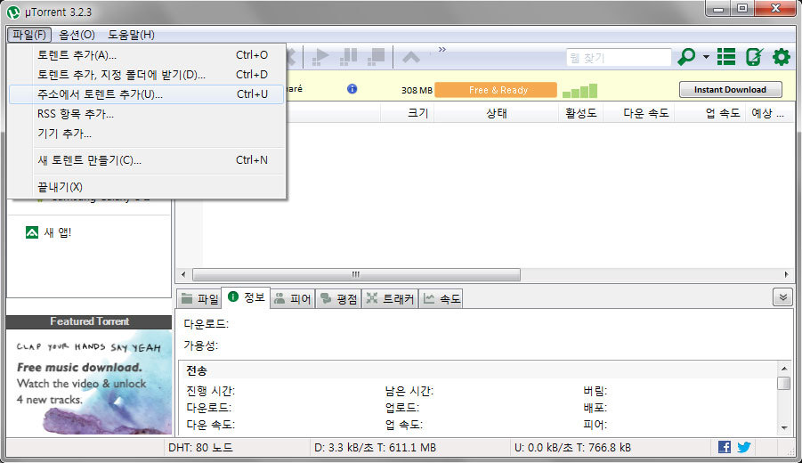 파일 - '주소에서 토렌트 추가'를 해봅니다.