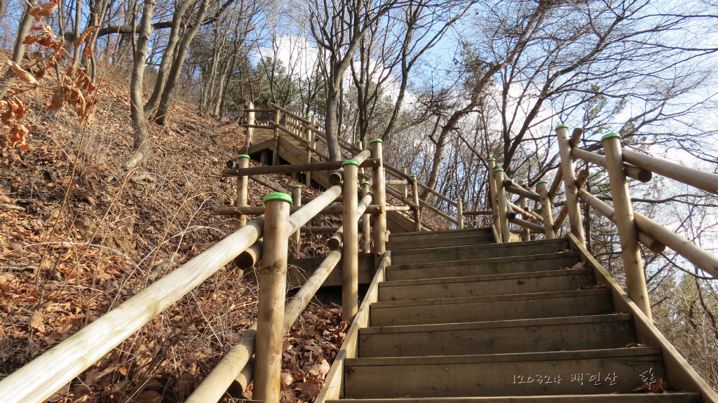 백련산에도 경사가 있어 나무계단이 ...