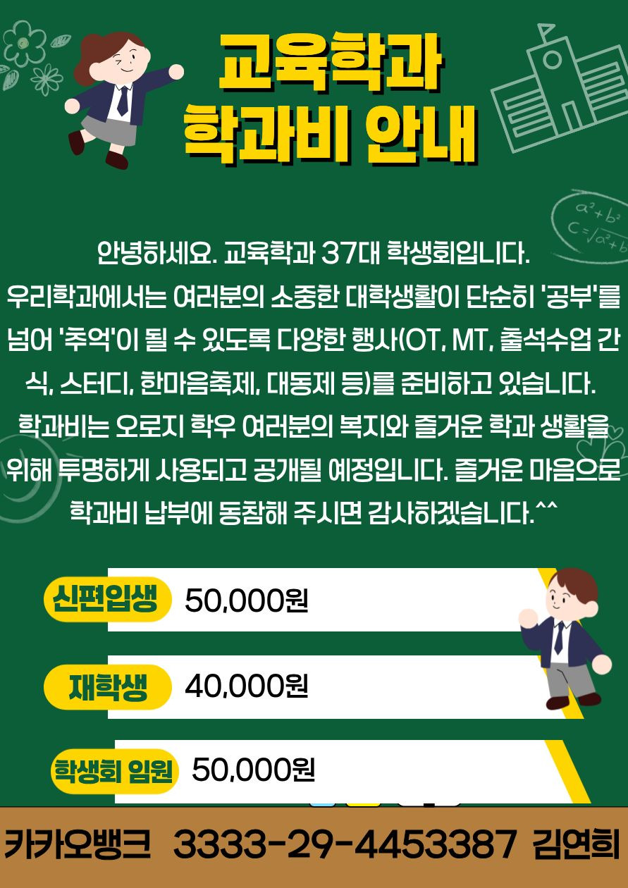 교육학과 학과비 납부안내 작성자안시현 3학년|작성시간26.02.24|조회수38 목록 댓글 0 글자크기 작게가 글자크기 크게가 교육학과 학과비 안내.pdf341.95KB 첨부파일첨부된 파일이 2개 있습니다. pdf 파일 교육학과 학과비 안내.pdf 다운로드 jpg 파일 교육학과 학과비 납부 안내.jpg 다운로드 다음검색 현재 게시글 추가 기능 열기 북마크 공유하기 신고 센터로 신고 댓글 댓글 0 댓글쓰기 답글쓰기 댓글 리스트