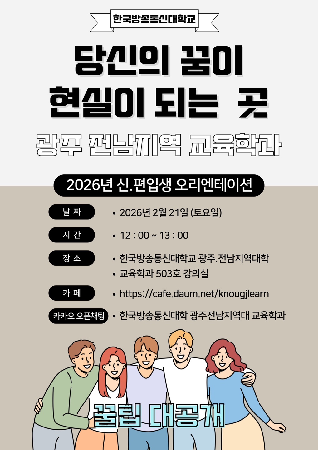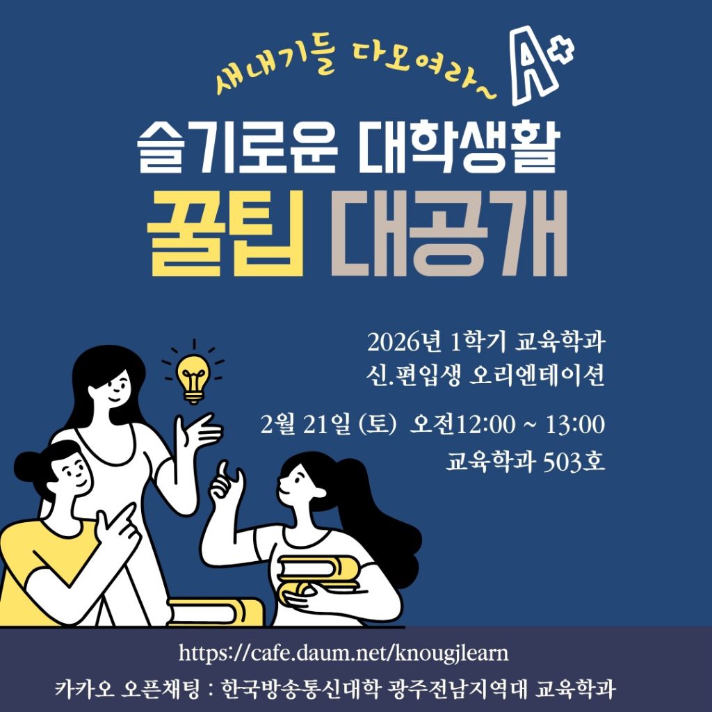 26년도 신편입 오리엔테이션 작성자박남수(202544,광주)|작성시간26.02.20|조회수13 목록 댓글 0 글자크기 작게가 글자크기 크게가 다음검색 현재 게시글 추가 기능 열기 북마크 공유하기 신고 센터로 신고 댓글 댓글 0 댓글쓰기 답글쓰기 댓글 리스트