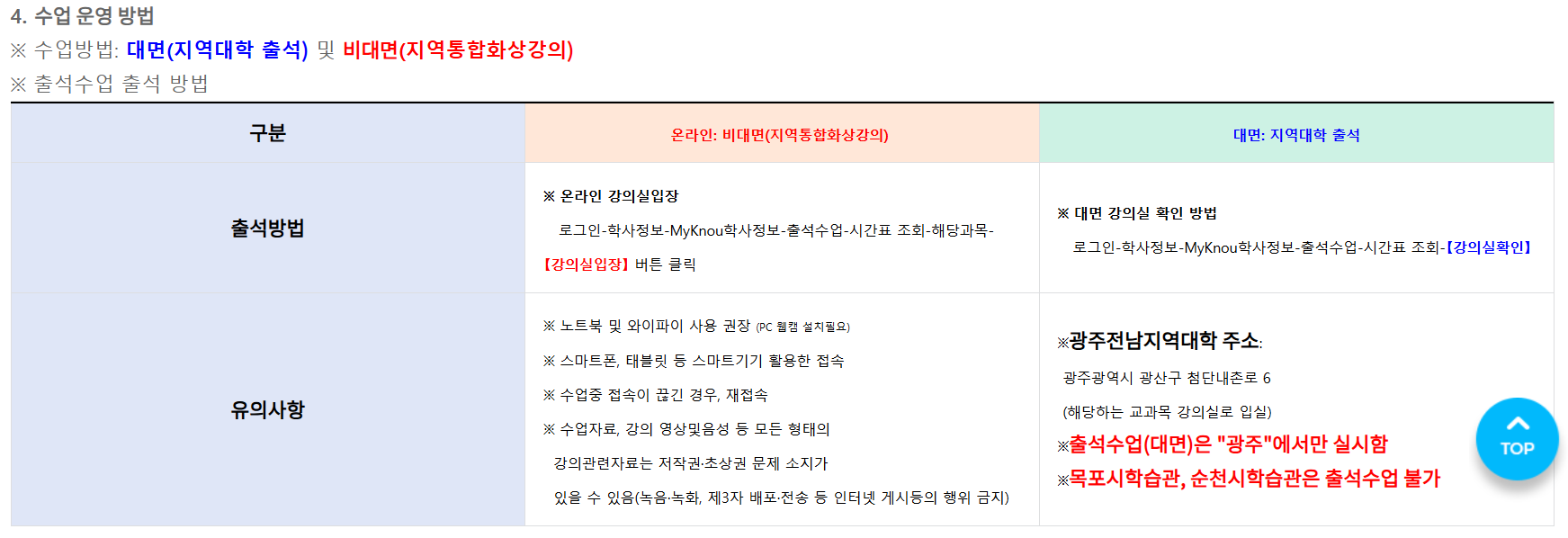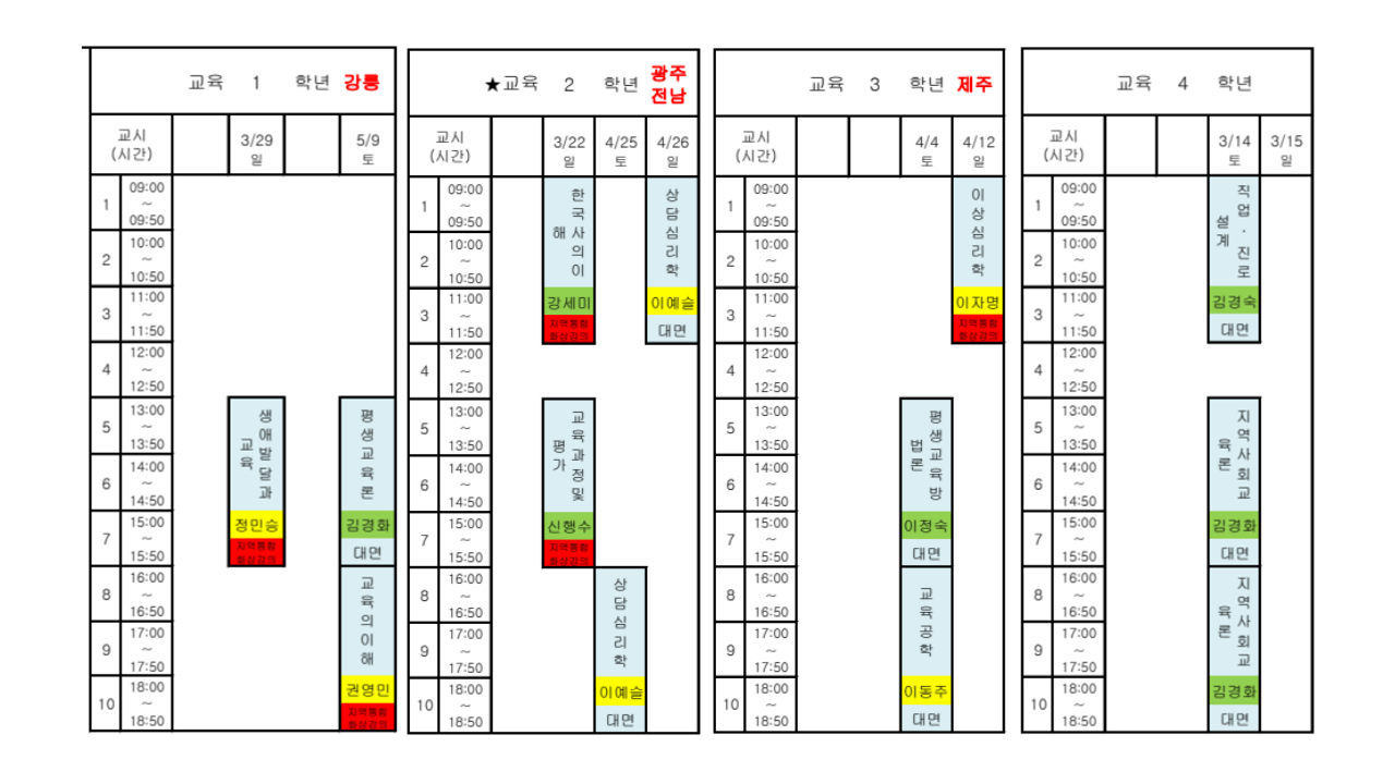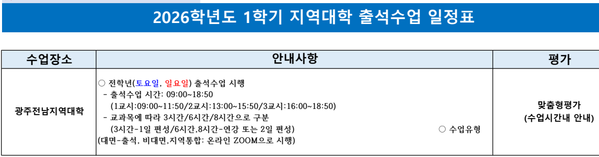 [수업] 2026.1학기 지역대학 출석수업 시간표(광주전남) - 변경0226 작성자박남수(202544,광주)|작성시간26.02.23|조회수37 목록 댓글 0 글자크기 작게가 글자크기 크게가 (광주전남게재용) 2026.1학기 지역대학별 출석수업 일정표(260220).pdf296.26KB 첨부파일첨부된 파일이 5개 있습니다. png 파일 출석수업26_1.png 다운로드 png 파일 출석수업26.png 다운로드 pdf 파일 (광주전남게재용) 2026.1학기 지역대학별 출석수업 일정표(260220).pdf 다운로드 etc 파일 슬라이드1.PNG 다운로드 png 파일 수업방법.png 다운로드 다음검색 현재 게시글 추가 기능 열기 북마크 공유하기 신고 센터로 신고 댓글 댓글 0 댓글쓰기 답글쓰기 댓글 리스트