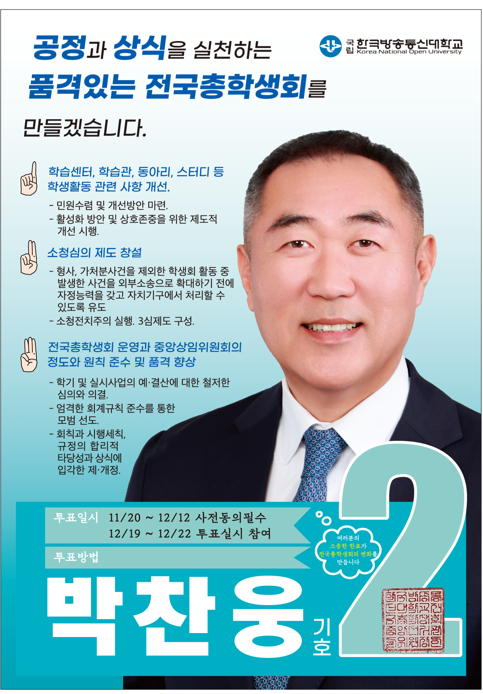 제44대 전국총학생회장 후보 기호2번 박찬웅 인사드립니다. 작성자전총회장선거(기호2번)선거사무장|작성시간25.12.10|조회수35 목록 댓글 0 글자크기 작게가 글자크기 크게가 다음검색 현재 게시글 추가 기능 열기 북마크 공유하기 신고 센터로 신고 댓글 댓글 0 댓글쓰기 답글쓰기 댓글 리스트